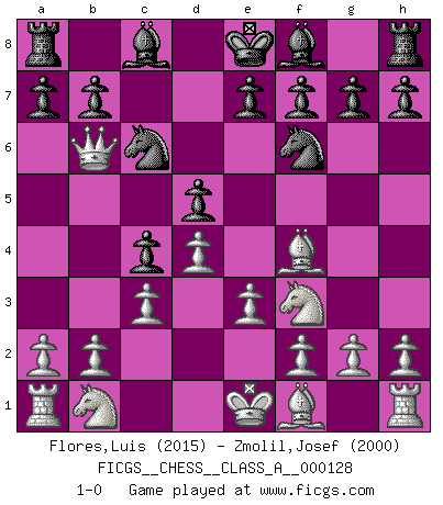 Last move : 1-0 2012 December 4 11:28:28 [Event "FICGS__CHESS__CLASS_A__000128"] [Site "FICGS"] [Date "2012.10.20"] [Round "1"] [White "Flores,Luis"] [Black "Zmolil,Josef"] [Result "1-0"] [WhiteElo "2015"] [BlackElo "2000"] 1.d4 d5 2.Nf3 Nf6 3.Bf4 c5 4.e3 Nc6 5.c3 Qb6 6.Qb3 c4 7.Qxb6 1-0 This chess game has been lost on time (started : 2012.10.20 11:59:24) Queen's Bishop game Player White won this chess game. Follow this game move after move (download)Nothing excites jaded Grandmasters more than a theoretical novelty. (Dominic Lawson) Auf Remis zu spielen ist gewissermaßen ein Verbrechen gegen das Schachspiel. (Mikhail Nekhemyevich Tal) Tu puedes aprender mucho mas de una partida que pierdas que de una partida ganada. Tendras que perder cientos de partidas antes de llegar a ser un buen jugador. (Jose Raul Capablanca) Avant la finale, les dieux ont créé le milieu de partie. (Tarrasch) Nowadays, anyone who cannot speak English and is incapable of using the Internet is regarded as backward. (Al-Waleed bin Talal)