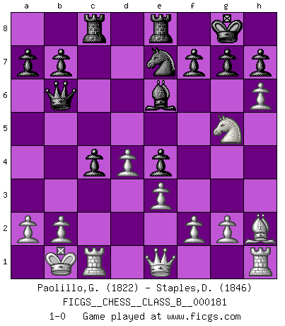 Last move : 1-0 2013 May 3 21:50:28 [Event "FICGS__CHESS__CLASS_B__000181"] [Site "FICGS"] [Date "2012.10.21"] [Round "1"] [White "Paolillo,Giampiero"] [Black "Staples,Daniel"] [Result "1-0"] [WhiteElo "1822"] [BlackElo "1846"] 1.d4 d5 2.c4 e6 3.Nc3 Be7 4.cxd5 exd5 5.Bf4 Nf6 6.Nf3 O-O 7.e3 c6 8.Bd3 Nbd7 9.Qc2 Re8 10.h3 Nf8 11.O-O-O Be6 12.Kb1 Ng6 13.Bh2 Rc8 14.Rc1 Bb4 15.h4 Bxc3 16.Qxc3 Ne4 17.Qe1 c5 18.h5 Ne7 19.h6 c4 20.Bc2 Qb6 21.Bxe4 dxe4 22.Ng5 1-0 This chess game has been lost on time (started : 2012.10.21 0:22:48) QGD : Charousek (Petrosian) variation Kingside Castling by player Black (move 6) Queenside Castling by player White (move 11) Player White won this chess game. Follow this game move after move (download)The Pawns are the soul of the game. (Francois Andre Danican Philidor) Ich möchte Schüler heranbilden, die das Vermögen haben, selbst zu denken und Kritik zu üben. (Emanuel Lasker) Por la belleza de sus partidas, la claridad de su juego y lo brillante de sus ideas, Fischer se creó el mismo como un artista de la misma estatura como Brahms, Rembrandt y Shakespeare. (David Levy) Un footballeur joue avec ses pieds, parfois avec sa tête. Un joueur d'échecs ne joue qu'avec sa tête. Et quand il ne joue plus, il meurt. (Jacob Murray) The general who wins the battle makes many calculations in his temple before the battle is fought. The general who loses makes but few calculations beforehand. (Sun Tzu)