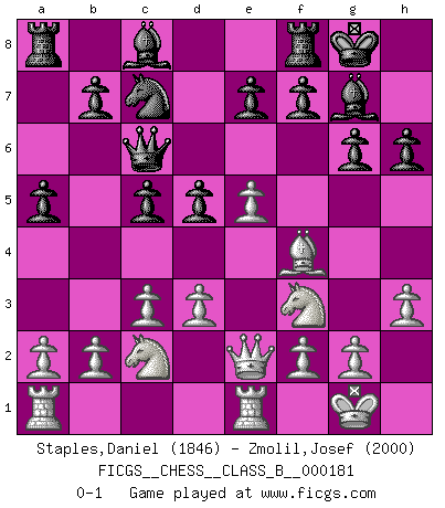 Last move : 0-1 2013 April 9 20:46:20 [Event "FICGS__CHESS__CLASS_B__000181"] [Site "FICGS"] [Date "2012.10.21"] [Round "1"] [White "Staples,Daniel"] [Black "Zmolil,Josef"] [Result "0-1"] [WhiteElo "1846"] [BlackElo "2000"] 1.e4 c5 2.Nf3 Nc6 3.Bb5 g6 4.O-O Bg7 5.c3 Nf6 6.Qe2 O-O 7.h3 Qb6 8.Na3 d5 9.d3 h6 10.Re1 a6 11.Bxc6 Qxc6 12.e5 Ne8 13.Nc2 a5 14.Bf4 Nc7 0-1 This chess game has been lost on time (started : 2012.10.21 0:22:48) Sicilian : Nimzovich-Rossolimo attack (with ...g6, without ...d6) Kingside Castling by player White (move 4) Kingside Castling by player Black (move 6) Player Black won this chess game. Follow this game move after move (download)After black's reply to 1.e4 with 1..e5, leaves him always trying to get into the game. (Howard Staunton) Jeder leidlich begabte Spieler, er braucht keineswegs hervorragend veranlagt zu sein, kann es zum Meister bringen. Aber das ist ja auch gar nicht nötig! Der richtige Standpunkt ist es, zu seinem Vergnügen zu spielen, und man glaube ja nicht, dass der Genuss proportional dem Können sei. (Siegbert Tarrasch) Una mala movida nulifica cuarenta buenas. (Horowitz) Les échecs, c'est l'imagination. (David Bronstein) The leaves of memory seemed to make a mournful rustling in the dark. (Henry Wadsworth Longfellow)