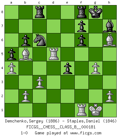 Last move : 1-0 2013 February 28 22:52:15 [Event "FICGS__CHESS__CLASS_B__000181"] [Site "FICGS"] [Date "2012.10.21"] [Round "1"] [White "Demchenko,Sergey"] [Black "Staples,Daniel"] [Result "1-0"] [WhiteElo "1886"] [BlackElo "1846"] 1.e4 c6 2.d4 d5 3.e5 Bf5 4.Nf3 e6 5.Be2 Ne7 6.O-O h6 7.Nbd2 Nd7 8.Nb3 Nc8 9.a4 a5 10.Ne1 c5 11.dxc5 Bxc5 12.Nxc5 Nxc5 13.Be3 Nd7 14.f4 Ne7 15.Nf3 O-O 16.Nd4 Rc8 17.c3 Nc5 18.Nb5 b6 19.Nd6 Rb8 20.Bb5 Ne4 21.g4 Bh7 22.f5 Nxd6 23.exd6 Qxd6 24.f6 Nc6 25.Qf3 e5 26.Rad1 e4 27.Qf4 Qxf4 28.Bxf4 Rbc8 29.Rxd5 gxf6 30.Bxh6 1-0 Caro-Kann : Advance variation Kingside Castling by player White (move 6) Kingside Castling by player Black (move 15) Player White won this chess game. Follow this game move after move (download)When your house is on fire, you can't be bothered with the neighbors. Or, as we say in Chess, if your King is under attack you don't worry about losing a Pawn on the Queen's side. (Gary Kasparov) Fischer ist das größte Genie, das je vom Schachhimmel heruntergestiegen ist. (Mikhail Nekhemyevich Tal) Juega la Apertura como un libro, el Juego Medio como un mago y los Finales como una máquina. (Spielmann) Toute estimation doit être constamment réévaluée. (Jacob Estrin) Panic is a sudden desertion of us, an a going over to the enemy of our imagination. (Christian Nevell Bovee)