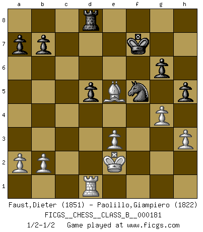 Last move : 1/2-1/2 2013 March 9 12:58:53 [Event "FICGS__CHESS__CLASS_B__000181"] [Site "FICGS"] [Date "2012.10.21"] [Round "1"] [White "Faust,Dieter"] [Black "Paolillo,Giampiero"] [Result "1/2-1/2"] [WhiteElo "1851"] [BlackElo "1822"] 1.c4 e5 2.Nc3 Bb4 3.Nd5 Bc5 4.e3 c6 5.d4 cxd5 6.dxc5 Qa5+ 7.Bd2 Qxc5 8.cxd5 Qxd5 9.Qg4 g6 10.Bc4 Qc6 11.Nf3 d5 12.Qg3 Qe6 13.Ng5 Qd6 14.Bc3 Nd7 15.Rd1 Ne7 16.f4 Qc5 17.Bd3 f6 18.fxe5 fxg5 19.e6 Rf8 20.exd7+ Bxd7 21.Qxg5 Bb5 22.Bd4 Qc6 23.Rf1 Rxf1+ 24.Bxf1 Bxf1 25.Kxf1 Qc2 26.Qg4 h5 27.Qe2 Qxe2+ 28.Kxe2 Nf5 29.Be5 Rd8 30.h3 Kf7 31.g4 1/2-1/2 English, Kramnik-Shirov counterattack This chess game ended in a draw. Follow this game move after move (download)You sit at the board and suddenly your heart leaps. Your hand trembles to pick up the piece and move it. But what Chess teaches you is that you must sit there calmly and think about whether it's really a good idea and whether there are other better ideas. (Stanley Kubrick) Taktik ist was man tun muß, wenn etwas zu tun ist. Strategie ist was man tun muß, wenn nichts zu tun ist. (Savielly Grigorievitsch Tartakower) Peones: ellos son el alma de esta partida, solos forman el ataque y la defensa. (Philidor) Ce n'est pas pour s'amuser qu'il joue aux échecs : il célèbre un culte. (Vladimir Nabokov) The greatest con, that he ever pulled... was making you believe... that he is you. (Revolver, movie)