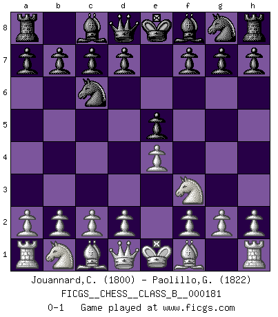 Last move : 0-1 2012 December 2 23:28:21 [Event "FICGS__CHESS__CLASS_B__000181"] [Site "FICGS"] [Date "2012.10.21"] [Round "1"] [White "Jouannard,Cedric"] [Black "Paolillo,Giampiero"] [Result "0-1"] [WhiteElo "1800"] [BlackElo "1822"] 1.e4 e5 2.Nf3 Nc6 0-1 This chess game has been lost on time (started : 2012.10.21 0:22:48) King's pawn game Player Black won this chess game. Follow this game move after move (download)Adequate compensation for a sacrifice is having a sound combination leading to a winning position; adequate compensation for a blunder is having your opponent snatch defeat from the jaws of victory. (Bruce A. Moon) Schach ist gnadenlos. Du mußt bereit sein zu töten. (Nigel Short) Cuando tengo las piezas blancas, yo gano porque soy blanco; Cuando tengo las piezas negras, yo gano porque soy Bogolyubov. (Bogolyubov) Le jeu d'échecs est comme rejeté hors du temps. (Antoine de Saint-Exupéry) If you lose the game you should win the analysis! (Proverb)