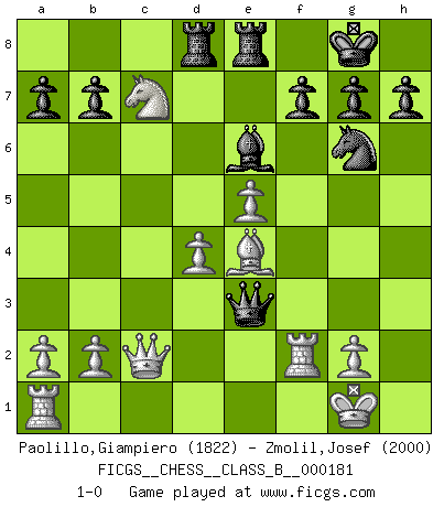 Last move : 1-0 2013 May 21 13:38:19 [Event "FICGS__CHESS__CLASS_B__000181"] [Site "FICGS"] [Date "2012.10.21"] [Round "1"] [White "Paolillo,Giampiero"] [Black "Zmolil,Josef"] [Result "1-0"] [WhiteElo "1822"] [BlackElo "2000"] 1.d4 d5 2.c4 e6 3.Nc3 Nf6 4.Bg5 Be7 5.Nf3 O-O 6.e3 Nbd7 7.Qc2 c6 8.cxd5 exd5 9.Bd3 Re8 10.O-O Nf8 11.h3 Ng6 12.Ne5 Nd7 13.Bxe7 Qxe7 14.f4 Ndxe5 15.fxe5 Qg5 16.e4 Bxh3 17.exd5 cxd5 18.Nxd5 Rad8 19.Be4 Be6 20.Nc7 Qe3+ 21.Rf2 1-0 QGD : 4.Bg5 Be7 Kingside Castling by player Black (move 5) Kingside Castling by player White (move 10) Player White won this chess game. Follow this game move after move (download)After a bad opening, there is hope for the middle game. After a bad middle game, there is hope for the endgame. But once you are in the endgame, the moment of truth has arrived. (Edmar Mednis) Schon mancher Spieler hat aufgegeben, um zu vermeiden, daß er eine Figur verliert. (Savielly Grigorievitsch Tartakower) El Ajedrez se juega con la mente... ¡no con las manos!. (Renaud y Kahn) Les erreurs sont comme les malheurs, elles n'arrivent jamais seules. (Siegbert Tarrasch) Hello Thibault, if I have had a plan (and I had one, I hope), I have forgotten it during the last week... - Hello Heinz-Georg. What do you mean a plan ? (Anonymous players, during a Big Chess game)