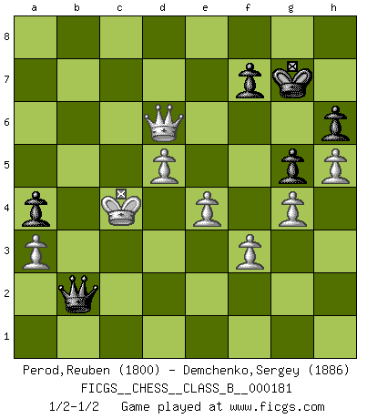 Last move : 1/2-1/2 2013 September 11 9:41:32 [Event "FICGS__CHESS__CLASS_B__000181"] [Site "FICGS"] [Date "2012.10.21"] [Round "1"] [White "Perod,Reuben"] [Black "Demchenko,Sergey"] [Result "1/2-1/2"] [WhiteElo "1800"] [BlackElo "1886"] 1.Nf3 Nf6 2.c4 g6 3.Nc3 Bg7 4.e4 d6 5.d4 O-O 6.h3 e5 7.d5 a5 8.Be3 Na6 9.g4 Nd7 10.a3 Nac5 11.Rg1 b6 12.Nd2 h6 13.Qc2 a4 14.Be2 c6 15.O-O-O cxd5 16.cxd5 Ba6 17.Bxa6 Rxa6 18.Kb1 b5 19.h4 Rb6 20.Na2 Qa8 21.Nb4 Rc8 22.Rc1 Rb7 23.Qd1 Rbc7 24.Qe2 Qb7 25.h5 g5 26.Rc3 Na6 27.Rgc1 Rxc3 28.Rxc3 Rxc3 29.bxc3 Bf8 30.c4 Nc7 31.Ka2 Nc5 32.f3 bxc4 33.Qxc4 Nb5 34.Nc6 Kh7 35.Nb1 Nd4 36.Nxd4 exd4 37.Bxd4 Bg7 38.Bxg7 Kxg7 39.Nd2 Qb6 40.Qb4 Qa6 41.Nc4 Kh7 42.Qc3 Nd7 43.Qd3 Nc5 44.Qc2 Kg8 45.Kb2 Nb3 46.Kc3 Qb5 47.Qf2 Nc5 48.Qb2 Nb3 49.Qc2 Na5 50.Nxa5 Qxa5+ 51.Kd3 Qb5+ 52.Kd2 Qf1 53.Qd1 Qf2+ 54.Kd3 Kf8 55.Qe2 Qc5 56.Qb2 Qg1 57.Qb8+ Kg7 58.Qxd6 Qd1+ 59.Ke3 Qc1+ 60.Kd3 Qb1+ 61.Kc4 Qb3+ 62.Kd4 Qb2+ 63.Kc4 1/2-1/2 Reti Opening Kingside Castling by player Black (move 5) Queenside Castling by player White (move 15) This chess game ended in a draw. Follow this game move after move (download)The combination player thinks forward; he starts from the given position, and tries the forceful moves in his mind. (Emanuel Lasker) Offener Brief an US-Präsident Bush anlässlich der Verhaftung Bobby Fishers: Verhaften Sie mich. Stecken Sie mich in dieselbe Zelle wie Bobby Fisher und geben Sie uns ein Schachspiel mit. (Boris Vassilievich Spassky) Mis oponentes también hacen buenas movidas. A veces yo no tomo esas cosas en consideración. (Bobby Fischer) La guerre est enfant de la passion, la passion est enfant du narcissisme et le narcissisme est l'enfant. (...) Une autre partie ? (Thibault de Vassal) They say poker is a zero-sum game. It must be, because every time I play my sum ends up zero. (Max Shapiro)