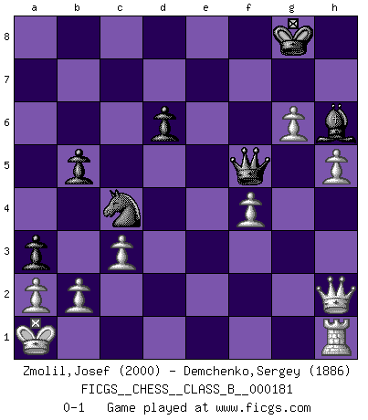 Last move : 0-1 2013 April 17 21:0:50 [Event "FICGS__CHESS__CLASS_B__000181"] [Site "FICGS"] [Date "2012.10.21"] [Round "1"] [White "Zmolil,Josef"] [Black "Demchenko,Sergey"] [Result "0-1"] [WhiteElo "2000"] [BlackElo "1886"] 1.e4 c5 2.Nf3 d6 3.d4 cxd4 4.Nxd4 Nf6 5.Nc3 g6 6.Be3 Bg7 7.f3 O-O 8.Qd2 Nc6 9.Bc4 Bd7 10.O-O-O Rc8 11.Bb3 Ne5 12.h4 h5 13.Bg5 Rc5 14.Kb1 b5 15.g4 a5 16.Bxf6 Bxf6 17.gxh5 a4 18.Bd5 e6 19.hxg6 exd5 20.h5 Bg5 21.f4 Nc4 22.Qh2 Bh6 23.Nxd5 f5 24.Nxf5 Rxf5 25.exf5 Rxd5 26.Rxd5 Qf6 27.c3 Bxf5+ 28.Rxf5 Qxf5+ 29.Ka1 a3 0-1 This chess game has been lost on time (started : 2012.10.21 0:22:48) Sicilian : Dragon, Yugoslav attack, 7...O-O Kingside Castling by player Black (move 7) Queenside Castling by player White (move 10) Player Black won this chess game. Follow this game move after move (download)Bobby Fischer is the greatest Chess player who has ever lived. (Ken Smith) Ich würde mich als ganz normalen Jungen bezeichnen [Im Alter von 12]. (Sergej Karjakin) El Peón aislado arroja penumbra sobre todo el tablero. (Aaron Nimzovich) Lorsque vous vous retrouvez devant une position atroce, ne tendez pas un ultime piège dérisoire avec l'intention d'abandonner si l'adversaire le déjoue ! Faites-vous plutôt un devoir de résister comme si votre vie en dépendait. Jouez le coup qui vous déplairait au centuple si vous étiez dans la peau de votre tortionnaire ! If you work for a living, why do you kill yourself working ? (Tuco to a chicken in The Good, The Bad and The Ugly)