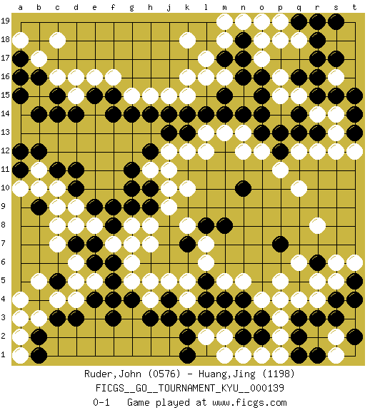 Last move : 0-1 2013 August 7 17:22:7 [Event "FICGS__GO__TOURNAMENT_KYU__000139"] [Site "FICGS"] [Date "2012.10.21"] [Round "1"] [Black "Ruder,John"] [White "Huang,Jing"] [Result "0-1"] [Rating 1 "0576"] [Rating 2 "1198"] 1.n10 q4 2.g10 d4 3.k7 k16 4.k13 k10 5.q16 d16 6.r6 q10 7.o3 p5 8.p7 n5 9.m4 r8 10.r3 r4 11.q3 q6 12.f3 d6 13.f5 f7 14.g7 g8 15.f8 g6 16.f6 h7 17.e7 g7 18.f9 j9 19.m8 h4 20.g4 h5 21.h3 k5 22.j3 m5 23.l5 l6 24.l4 l7 25.l8 k8 26.c14 c8 27.d10 b10 28.c11 b15 29.c15 c16 30.b14 f16 31.c5 d5 32.c3 c4 33.b4 b5 34.d3 r14 35.n17 s16 36.r17 l17 37.s4 s5 38.s3 l12 39.m14 n12 40.o13 o12 41.p13 q12 42.f14 h15 43.h14 g15 44.g14 b3 45.b2 a4 46.b16 b17 47.a15 c18 48.s17 r5 49.s15 s14 50.r16 m18 51.n18 k4 52.k3 h11 53.g11 b11 54.b12 c10 55.d11 n3 56.n4 o4 57.n2 p3 58.o2 p2 59.q2 p1 60.q1 m2 61.m3 l2 62.l3 n1 63.k2 o1 64.n3 p4 65.k1 n19 66.o19 m19 67.m17 k18 68.p12 p11 69.q13 r12 70.r13 s13 71.t5 t6 72.t4 s6 73.h12 j11 74.q14 n13 75.n14 l13 76.l14 k12 77.j13 o18 78.p19 p18 79.q19 q18 80.r18 r19 81.s19 p16 82.o16 q15 83.r15 p15 84.o14 o17 85.o15 m16 86.n16 k15 87.k14 a2 88.b1 m1 89.t14 s12 90.q19 o19 91.m15 l16 92.d7 c7 93.e15 e16 94.h9 h8 95.h10 j10 96.e4 d15 97.d14 d9 98.e9 d8 99.f15 j15 100.j4 j5 101.a11 a10 102.a12 m13 103.a17 a18 104.t13 t12 105.t15 a16 106.b9 c9 107.a17 e8 108.e6 g5 109.a16 e5 110.f4 j12 111.g9 p19 112.r19 a3 113.j14 s2 114.t2 s1 115.r1 a1 0-1 This go game has been lost on time (started : 2012.10.21 22:42:5) Here are the names of the openings (joseki) played in the four corners : Corner q4 : q4 r6 Hoshi (Hwajeom, Seongjeom, Xingwei`) 4-4 Point. The star or hoshi (4-4) point, emphasizing influence at the potential expense of territory. Ikken Kakari (Hankan Keolch'im, Yi Gua`jiao~, 1-Space Low Approach). Black 2 is the standard approach move to the 4-4. Corner d4 : d4 f3 Hoshi (Hwajeom, Seongjeom, Xingwei`) 4-4 Point. The star or hoshi (4-4) point, emphasizing influence at the potential expense of territory. Ikken Kakari (Hankan Keolch'im, Yi Gua`jiao~, 1-Space Low Approach). Black 2 is the standard approach move to the 4-4. Corner d16 : d16 c14 Hoshi (Hwajeom, Seongjeom, Xingwei`) 4-4 Point. The star or hoshi (4-4) point, emphasizing influence at the potential expense of territory. Ikken Kakari (Hankan Keolch'im, Yi Gua`jiao~, 1-Space Low Approach). Black 2 is the standard approach move to the 4-4. Corner q16 : q16 r14 Hoshi (Hwajeom, Seongjeom, Xingwei`) 4-4 Point. The star or hoshi (4-4) point, emphasizing influence at the potential expense of territory. Ikken Kakari (Hankan Keolch'im, Yi Gua`jiao~, 1-Space Low Approach). White 2 is the standard approach move to the 4-4. Player White won this Go (weiqi, baduk) game. Follow this game move after move (download)One point in the center is worth ten in the corner. (Anonymous) This is where the fun begins. (Anakin Skywalker in Star Wars ep.3)