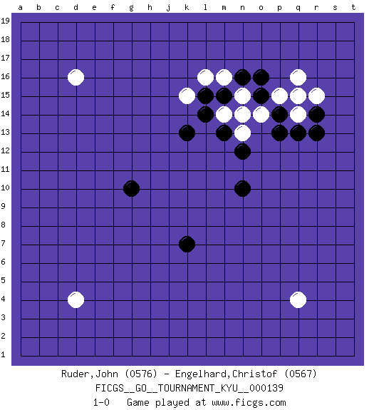 Last move : 1-0 2012 November 8 11:40:56 [Event "FICGS__GO__TOURNAMENT_KYU__000139"] [Site "FICGS"] [Date "2012.10.21"] [Round "1"] [Black "Ruder,John"] [White "Engelhard,Christof"] [Result "1-0"] [Rating 1 "0576"] [Rating 2 "0567"] 1.n10 d4 2.g10 q4 3.k7 d16 4.k13 q16 5.r14 q14 6.q13 r15 7.p14 q15 8.r13 o14 9.p13 p15 10.o15 n15 11.o16 n14 12.n16 m16 13.m15 m14 14.l15 l16 15.l14 k15 16.m13 n13 17.n12 1-0 Here are the names of the openings (joseki) played in the four corners : Corner q16 : q16 r14 Hoshi (Hwajeom, Seongjeom, Xingwei`) 4-4 Point. The star or hoshi (4-4) point, emphasizing influence at the potential expense of territory. Ikken Kakari (Hankan Keolch'im, Yi Gua`jiao~, 1-Space Low Approach). Black 2 is the standard approach move to the 4-4. Player Black won this Go (weiqi, baduk) game. Follow this game move after move (download)Beware of the clumsy double contact. (Anonymous) If only faces could talk... (Pat Summerall, Sportscaster during the Super Bowl)
