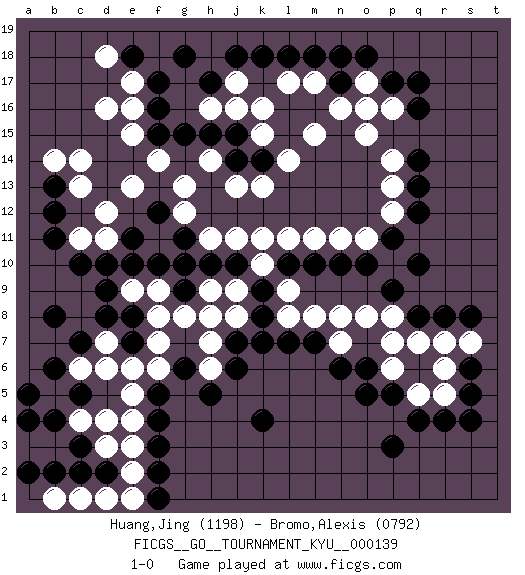 Last move : 1-0 2013 March 7 6:5:52 [Event "FICGS__GO__TOURNAMENT_KYU__000139"] [Site "FICGS"] [Date "2012.10.21"] [Round "1"] [Black "Huang,Jing"] [White "Bromo,Alexis"] [Result "1-0"] [Rating 1 "1198"] [Rating 2 "0792"] 1.q16 d4 2.r4 d16 3.f3 e3 4.f4 e4 5.f5 e5 6.c7 c6 7.b6 b5 8.c5 d6 9.b4 c4 10.a5 b3 11.c10 d12 12.e8 d7 13.d8 f6 14.g6 f7 15.k4 k10 16.q10 k16 17.n17 m15 18.f17 e17 19.f16 e16 20.f15 e15 21.k18 j17 22.j18 o15 23.q14 p14 24.q13 p13 25.o10 o11 26.n10 n11 27.m10 m11 28.l10 l11 29.k9 j9 30.j10 k11 31.k8 j8 32.h10 h9 33.g9 g8 34.j7 h8 35.f10 h11 36.b12 c13 37.b13 b14 38.g11 j11 39.g10 g12 40.f12 g13 41.h15 h14 42.j15 k15 43.j14 j13 44.k14 l14 45.h17 k13 46.q17 p16 47.p17 o16 48.p11 p12 49.q12 h16 50.g15 j16 51.g18 f14 52.e18 d18 53.p3 h6 54.h5 h7 55.j6 m17 56.m18 l17 57.l18 o17 58.o18 n16 59.n18 e13 60.e11 d11 61.d10 f8 62.e7 e6 63.b8 c11 64.b11 c14 65.b2 a3 66.d2 e2 67.c3 d3 68.c2 d1 69.f2 c1 70.a2 b1 71.a4 e1 72.f1 r6 73.r8 q7 74.q8 p7 75.p5 p8 76.p9 o8 77.o6 n8 78.m7 m8 79.l7 l8 80.s4 l9 81.k7 n7 82.n6 q5 83.q4 p6 84.o5 r7 85.s8 s7 86.s5 r5 87.s6 e9 88.d9 f9 89.e10 1-0 Here are the names of the openings (joseki) played in the four corners : Corner d4 : d4 f3 Hoshi (Hwajeom, Seongjeom, Xingwei`) 4-4 Point. The star or hoshi (4-4) point, emphasizing influence at the potential expense of territory. Ikken Kakari (Hankan Keolch'im, Yi Gua`jiao~, 1-Space Low Approach). Black 2 is the standard approach move to the 4-4. Player Black won this Go (weiqi, baduk) game. Follow this game move after move (download)Each step in a ladder is worth 7 points. (Anonymous) Always remember that you are unique; just like everyone else. (Unknown)