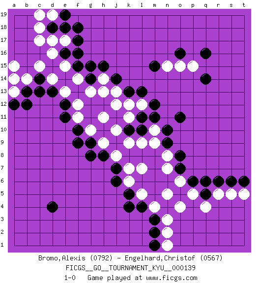 Last move : 1-0 2013 January 7 16:29:43 [Event "FICGS__GO__TOURNAMENT_KYU__000139"] [Site "FICGS"] [Date "2012.10.21"] [Round "1"] [Black "Bromo,Alexis"] [White "Engelhard,Christof"] [Result "1-0"] [Rating 1 "0792"] [Rating 2 "0567"] 1.q16 d16 2.d4 q4 3.k10 l7 4.j7 l9 5.k5 l5 6.o11 k6 7.j6 k7 8.l4 m4 9.k4 j8 10.h8 h9 11.g8 k9 12.l10 j10 13.j11 h11 14.g9 g10 15.f9 k11 16.l11 j12 17.f10 f11 18.e11 f12 19.e12 l12 20.m11 m10 21.n10 m9 22.n9 n8 23.o8 n7 24.o7 o6 25.p6 o4 26.m3 n5 27.m12 p5 28.q6 n3 29.m2 n2 30.m1 n1 31.l13 k12 32.k13 j13 33.j14 h14 34.h15 g13 35.g14 h13 36.g15 f14 37.f15 e15 38.f16 e13 39.d13 d14 40.c14 c15 41.c13 b14 42.b13 a13 43.a12 a14 44.b12 a15 45.e16 e17 46.f17 c17 47.e18 d17 48.d18 c18 49.f18 d19 50.e19 c19 51.q5 r5 52.r6 s5 53.s6 t5 54.t6 n15 55.m15 o15 56.o16 p15 57.q14 1-0 Here are the names of the openings (joseki) played in the four corners : Corner d16 : d16 j11 Hoshi (Hwajeom, Seongjeom, Xingwei`) 4-4 Point. The star or hoshi (4-4) point, emphasizing influence at the potential expense of territory. Player Black won this Go (weiqi, baduk) game. Follow this game move after move (download)Everything happens on a grid-engraved board with black and white pieces, but if that's all you see then you don't know Go. (Pierre Audouard) Wipe them out. All of them. (Darth Sidious in Star Wars ep.1)