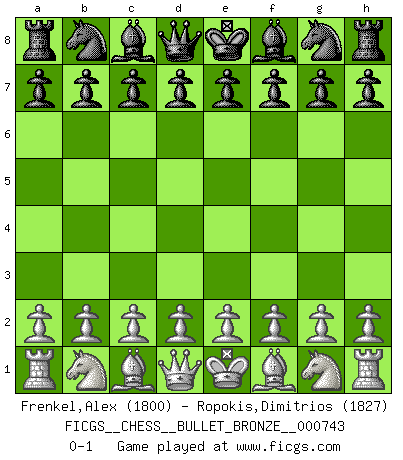 Last move : 0-1 2012 October 22 10:22:34 [Event "FICGS__CHESS__BULLET_BRONZE__000743"] [Site "FICGS"] [Date "2012.10.22"] [Round "1"] [White "Frenkel,Alex"] [Black "Ropokis,Dimitrios"] [Result "0-1"] [WhiteElo "1800"] [BlackElo "1827"] 0-1 This chess game has been lost on time (started : 2012.10.22 7:19:58) Player Black won this chess game. Follow this game move after move (download)By this measure (on the gap between Fischer & his contemporaries), I consider him the greatest world champion. (Garry Kasparov) Wer mein Gambit spielt, muß bereit sein, alle Brücken hinter sich abzubrechen. Es verändert den ganzen Menschen. Es wirkt wie ein Zauberstab und fördert verkümmerte, gute Charakter- eigenschaften wieder zu Tage. (Emil Joseph Diemer) A la fecha, Fischer esta simplemente un nivel arriba de todos los mejores jugadores de Ajedrez del mundo. (John Jacobs) Je crois qu'il existe des manières très spécifiques de jouer efficacement contre une machine. Evidemment, nous n'avons aucune chance en technique pure, parce que l'ordinateur calcule de manière parfaite. Mais lorsque nous faisons appel à notre cerveau, en utilisant l'intuition et la compréhension, alors nous restons beaucoup plus forts. (Anatoli Karpov) History is the quarrels of popes and kings, with wars or pestilences in every page; the men all so good for nothing, and hardly any women at all. (Jane Austen)
