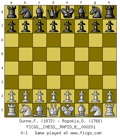 Last move : 0-1 2012 November 22 23:1:49 [Event "FICGS__CHESS__RAPID_B__000201"] [Site "FICGS"] [Date "2012.10.23"] [Round "1"] [White "Dunne,Francesco"] [Black "Ropokis,Dimitrios"] [Result "0-1"] [WhiteElo "1872"] [BlackElo "1766"] 0-1 This chess game has been lost on time (started : 2012.10.23 15:19:2) Player Black won this chess game. Follow this game move after move (download)For me, Chess is life and every game is like a new life. Every Chess player gets to live many lives in one lifetime. (Eduard Gufeld) Du kannst im Schach nur gut werden, wenn du das Spiel liebst. (Robert James Fischer) Hasta este punto, las blancas han seguido un análisis bien conocido. Pero ahora el hace un error fatal: empieza a usar su propia cabeza. (Siegbert Tarrasch) C'est une question de caractère, Beaucoup de gens perdent leur motivation très vite. D'autres, ils sont rares, peuvent la conserver très longtemps. J'aime les échecs, encore aujourd'hui je suis heureux d'analyser des parties. J'aime toujours gagner, je déteste encore perdre. Bien jouer est important pour mon intégrité intellectuelle et morale. Et puis les échecs vivent en ce moment une période historique grâce à Internet. Ils se développent dans les systèmes éducatifs à travers le monde. Ils sortent de leur ghetto, et c'est mon rôle de mener à bien cette révolution. (Gary Kasparov) Man with more than one clock never knows what time it is. (Chinese thought)