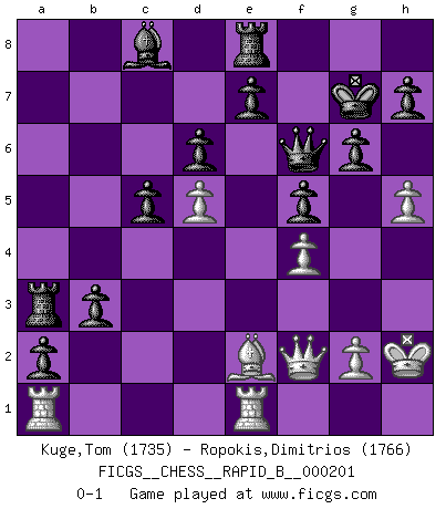 Last move : 0-1 2012 December 11 19:28:55 [Event "FICGS__CHESS__RAPID_B__000201"] [Site "FICGS"] [Date "2012.10.23"] [Round "1"] [White "Kuge,Tom"] [Black "Ropokis,Dimitrios"] [Result "0-1"] [WhiteElo "1735"] [BlackElo "1766"] 1.e4 c5 2.a3 g6 3.b4 Bg7 4.Nc3 d6 5.Bb2 Nf6 6.Nd5 O-O 7.d3 Nc6 8.Qd2 Nxd5 9.Bxg7 Kxg7 10.exd5 Nd4 11.Be2 a5 12.Nf3 Nxf3+ 13.Bxf3 axb4 14.O-O Qa5 15.Qe3 Re8 16.h4 bxa3 17.h5 Qc3 18.Be4 a2 19.Qg3 Qxc2 20.f4 f5 21.Bf3 Qxd3 22.Qg5 Qd4+ 23.Kh2 b5 24.Rfe1 Qf6 25.Qg3 b4 26.Be2 Ra3 27.Qf2 b3 0-1 Sicilian defense Kingside Castling by player Black (move 6) Kingside Castling by player White (move 14) Player Black won this chess game. Follow this game move after move (download)Fischer sacrificed virtually everything most of us weakies (to use his term) value, respect, and cherish, for the sake of an artful, often beautiful board game, for the ambivalent privilege of being its greatest master. (Paul Kollar) Ich las kürzlich ein Buch von Nietzsche. Er sagte Religion verdumme nur die Menschen. Ich stimme zu. (Robert James Fischer) Cuando le juegas a Fischer, no es una cuestion de si vas a ganar o perder. Es una cuestion de si vas a sobrevivir. (Boris Spassky) J'apprécie les joueurs d'est-indienne, c'est grâce à eux que je nourris ma famille depuis tant d'années. (Petrosian) He who defends everything defends nothing. (Frederick the Great)