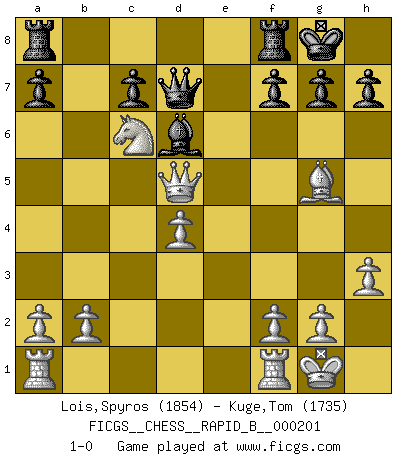 Last move : 1-0 2012 November 28 11:22:30 [Event "FICGS__CHESS__RAPID_B__000201"] [Site "FICGS"] [Date "2012.10.23"] [Round "1"] [White "Lois,Spyros"] [Black "Kuge,Tom"] [Result "1-0"] [WhiteElo "1854"] [BlackElo "1735"] 1.e4 e5 2.Nf3 Nf6 3.Nxe5 d6 4.Nf3 Nxe4 5.d4 d5 6.Bd3 Nc6 7.O-O Bg4 8.c4 Nf6 9.Nc3 Be7 10.cxd5 Nxd5 11.Be4 Nf6 12.Bxc6+ bxc6 13.h3 Be6 14.Ne5 Bd6 15.Nxc6 Qd7 16.Qf3 O-O 17.Bg5 Bd5 18.Nxd5 Nxd5 19.Qxd5 1-0 Petrov : Classical attack Kingside Castling by player White (move 7) Kingside Castling by player Black (move 16) Player White won this chess game. Follow this game move after move (download)For me, Chess is life and every game is like a new life. Every Chess player gets to live many lives in one lifetime. (Eduard Gufeld) Wer mein Gambit spielt, muß bereit sein, alle Brücken hinter sich abzubrechen. Es verändert den ganzen Menschen. Es wirkt wie ein Zauberstab und fördert verkümmerte, gute Charakter- eigenschaften wieder zu Tage. (Emil Joseph Diemer) Aquel que toma al Peón de Caballo de la Reina, se pasará la noche a dormir en la calle. (Anónimo) Aux échecs, les retours au sommet sont rares : les dommages psychologiques consécutifs à une défaite sont trop sévères. (Daily Telegraph) Memory is a complicated thing, a relative to truth, but not its twin. (Barbara Kingsolver, Animal Dreams)