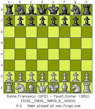 Last move : 0-1 2012 November 22 23:1:49 [Event "FICGS__CHESS__RAPID_B__000201"] [Site "FICGS"] [Date "2012.10.23"] [Round "1"] [White "Dunne,Francesco"] [Black "Faust,Dieter"] [Result "0-1"] [WhiteElo "1872"] [BlackElo "1851"] 0-1 This chess game has been lost on time (started : 2012.10.23 15:19:2) Player Black won this chess game. Follow this game move after move (download)Chess is a forcing house where the fruits of character can ripen more fully than in life. (Edward Morgan Foster) Deine Wertungszahl - vorausgesetzt einige Jahre schachliche Anstrengung - entspricht etwa dem zehnfachen Deines IQ plus 1000. (Jonathan Levitt) Hoy en día, si tu no eres un Gran Maestro a los 14 años, es mejor que lo olvides. (Anand Viswanathan) Il n'y a pas de prix trop élevé au scalp de l'ennemi. (Koblentz) Everybody lies. (Gregory House, House M.D.)