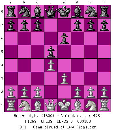 Last move : 0-1 2012 December 4 11:28:28 [Event "FICGS__CHESS__CLASS_D__000188"] [Site "FICGS"] [Date "2012.10.23"] [Round "1"] [White "Robertsi,Neil"] [Black "Valentin,Laurentiu"] [Result "0-1"] [WhiteElo "1600"] [BlackElo "1478"] 1.d4 d5 2.e3 e6 0-1 This chess game has been lost on time (started : 2012.10.23 23:9:58) Queen's pawn game Player Black won this chess game. Follow this game move after move (download)You are for me the Queen on d8 and I am the Pawn on d7 !! (Eduard Gufeld) Schach ist die gewalttätigste aller Sportarten. (Garry Kasparov) Debes de llevar a tu oponente hacia un profundo y obscuro bosque donde 2+2=5, y el camino que conduce a la salida es suficientemente ancho para solamente uno. (Mikhail Tal) Shah mat. Le roi est mort. Cri de fierté d'un joueur venant de terrasser son adversaire, courtoisement, sans effusion de sang. I think your argument is specious - I think your tie is ugly. (Gregory House to Dr. Foreman, House M.D.)