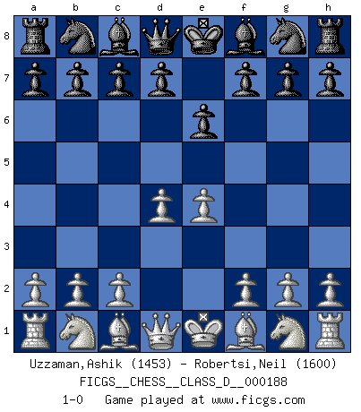 Last move : 1-0 2012 December 6 11:33:43 [Event "FICGS__CHESS__CLASS_D__000188"] [Site "FICGS"] [Date "2012.10.23"] [Round "1"] [White "Uzzaman,Ashik"] [Black "Robertsi,Neil"] [Result "1-0"] [WhiteElo "1453"] [BlackElo "1600"] 1.e4 e6 2.d4 1-0 This chess game has been lost on time (started : 2012.10.23 23:9:58) French defense Player White won this chess game. Follow this game move after move (download)Chess mastery essentially consists of analyzing Chess positions accurately. (Mikhail Botvinnik) Obwohl ich alt bin, darf mir niemand den Finger in den Mund stecken, sonst beisse ich. (Wilhelm Steinitz) Aquel que toma al Peón de Caballo de la Reina, se pasará la noche a dormir en la calle. (Anónimo) J'apprécie les joueurs d'est-indienne, c'est grâce à eux que je nourris ma famille depuis tant d'années. (Petrosian) Fortune favours the audacious. (Desiderius Erasmus)