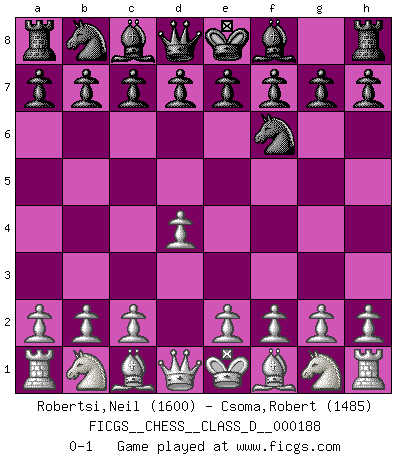 Last move : 0-1 2012 December 5 11:34:3 [Event "FICGS__CHESS__CLASS_D__000188"] [Site "FICGS"] [Date "2012.10.23"] [Round "1"] [White "Robertsi,Neil"] [Black "Csoma,Robert"] [Result "0-1"] [WhiteElo "1600"] [BlackElo "1485"] 1.d4 Nf6 0-1 This chess game has been lost on time (started : 2012.10.23 23:9:58) Queen's pawn game Player Black won this chess game. Follow this game move after move (download)Chess is imagination. (David Bronstein) Ich möchte Schüler heranbilden, die das Vermögen haben, selbst zu denken und Kritik zu üben. (Emanuel Lasker) Personalmente, yo prefiero mirar hacia el futuro en donde un programa de computadora gane el título mundial de Ajedrez. La humanidad necesita una lección de humildad. (Richard Dawkings) On est toujours la mazette de quelqu'un d'autre. (Anonyme) Remember : Your focus determines your reality. (Qui-Gon Jinn in Star Wars ep.1)