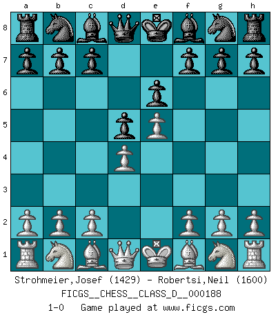 Last move : 1-0 2012 December 6 11:33:43 [Event "FICGS__CHESS__CLASS_D__000188"] [Site "FICGS"] [Date "2012.10.23"] [Round "1"] [White "Strohmeier,Josef"] [Black "Robertsi,Neil"] [Result "1-0"] [WhiteElo "1429"] [BlackElo "1600"] 1.e4 e6 2.d4 d5 3.e5 1-0 This chess game has been lost on time (started : 2012.10.23 23:9:58) French : Advance variation Player White won this chess game. Follow this game move after move (download)Everything is in a state of flux, and this includes the world of Chess. (Mikhail Botvinnik) Ich spiele 70 Eröffnungssysteme. (Viktor Kortschnoi) El Ajedrez demanda una total concentración. (Bobby Fischer) Tout change constamment, y compris dans le monde des Echecs. (Botvinnik) Excelling at chess has long been considered a symbol of more general intelligence. That is an incorrect assumption in my view, as pleasant as it might be. But for the purposes of argument and investigation, chess is, in Russkin-Gutman's words, 'an unparalleled laboratory, since both the learning process and the degree of ability obtained can be objectified and quantified, providing an excellent comparative framework on which to use rigorous analytical techniques.' (The Chess Master and the Computer, by Garry Kasparov - 2010)