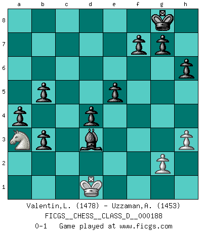 Last move : 0-1 2012 December 15 20:6:8 [Event "FICGS__CHESS__CLASS_D__000188"] [Site "FICGS"] [Date "2012.10.23"] [Round "1"] [White "Valentin,Laurentiu"] [Black "Uzzaman,Ashik"] [Result "0-1"] [WhiteElo "1478"] [BlackElo "1453"] 1.e4 c5 2.b4 cxb4 3.Bb2 Nc6 4.d4 d5 5.e5 e6 6.Bd3 Nh6 7.Ne2 a5 8.O-O Qh4 9.Ng3 Bd7 10.Nd2 Nxd4 11.Nf3 Nxf3+ 12.Qxf3 Bc5 13.Qe2 Ng4 14.h3 Nxf2 15.Kh2 Nxd3 16.cxd3 Bb5 17.Qf3 O-O 18.Rfc1 Rac8 19.Rc2 Bd4 20.Rxc8 Rxc8 21.Bxd4 Qxd4 22.Rf1 Rc7 23.Ne2 Qxe5+ 24.Kh1 h6 25.Ng3 Be8 26.Qf4 Qxf4 27.Rxf4 Rc2 28.Nf1 Rxa2 29.Kg1 b3 30.Rf2 Rxf2 31.Kxf2 a4 32.Nd2 d4 33.Ke2 e5 34.Kd1 Bb5 35.Nb1 Bxd3 36.Na3 b5 0-1 Sicilian : wing gambit Kingside Castling by player White (move 8) Kingside Castling by player Black (move 17) Player Black won this chess game. Follow this game move after move (download)It is not enough to be a good player... you must also play well. (Siegbert Tarrasch) Ich trinke, ich rauche, ich spiele, ich liebe Frauen aber Fernschach ist ein Laster, das ich nicht habe. (Mikhail Nekhemyevich Tal) ¿Quién es tu oponente esta tarde? Esta tarde mi oponente son las piezas negras. (Akiba Rubinstein) D'abord les bases : Jouez et étudiez, puis étudiez et jouez, ensuite jouez et étudiez, puis étudiez et jouez. Deuxièmement : Donnez toujours le meilleur de vous-même ! (Ken Smith) Don't be irreplaceable, if you can't be replaced, you can't be promoted. (Dan Rotaru)