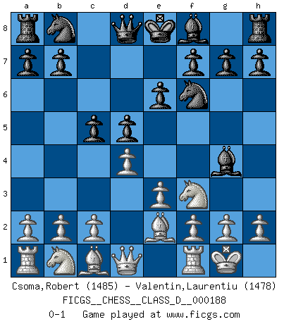 Last move : 0-1 2012 December 6 11:33:43 [Event "FICGS__CHESS__CLASS_D__000188"] [Site "FICGS"] [Date "2012.10.23"] [Round "1"] [White "Csoma,Robert"] [Black "Valentin,Laurentiu"] [Result "0-1"] [WhiteElo "1485"] [BlackElo "1478"] 1.Nf3 d5 2.d4 Bg4 3.e3 e6 4.Be2 Nf6 5.O-O c5 0-1 This chess game has been lost on time (started : 2012.10.23 23:9:58) Reti Opening Kingside Castling by player White (move 5) Player Black won this chess game. Follow this game move after move (download)Methodical thinking is of more use in Chess than inspiration. (C. J. S. Purdy) Die westlichen Werte sind eine Sprache, welche die Putin-Administration nicht versteht. (Garry Kasparov) Cuando estes solo, cuando te sientas un extraño en el mundo, juega al Ajedrez. Esto levantará tu espiritu y será tu consejero de guerra. (Aristóteles) Les Echecs sont affaire de jugement sensible. Savoir quand frapper et quand esquiver. (Fischer) My poor ole parrot... Is not in the circulation of displays ....poo hoo hoo :) (Wayne Lowrance's enigma)