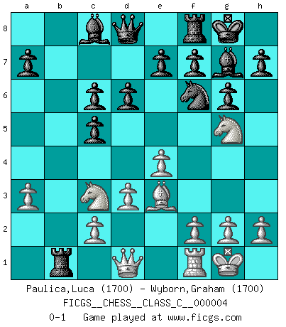 Last move : 0-1 2006 August 26 18:45:33 [Event "FICGS__CHESS__CLASS_C__000004"] [Site "FICGS"] [Date "2006.05.16"] [Round "1"] [White "Paulica,Luca"] [Black "Wyborn,Graham"] [Result "0-1"] [WhiteElo "1700"] [BlackElo "1700"] 1.e4 c5 2.Nf3 d6 3.Bb5+ Nc6 4.Bxc6+ bxc6 5.d3 g6 6.Ng5 Bg7 7.Nc3 Nf6 8.a3 O-O 9.O-O Rb8 10.Be3 Rxb2 11.Rb1 Rxb1 0-1 Sicilian : Canal-Sokolsky (Nimzovich-Rossolimo, Moscow) attack Kingside Castling by player Black (move 8) Kingside Castling by player White (move 9) Player Black won this chess game. Follow this game move after move (download)Chess is a more highly symbolic game, but the aggressions are therefore even more frankly represented in the play. It probably began as a war game; that is, the representation of a miniature battle between the forces of two kingdoms. (Karl Meninger) Sie bekommen vielleicht den Eindruck, dass die Spitzenspieler überhaupt gar nicht so stark sind. Aber das stimmt nicht. Es ist eine Illusion. Mit einem Computer an der Seite ist es sehr leicht, Urteile zu fällen, aber wenn man alleine am Brett sitzt, sieht die Sache ganz anders aus. (Vladimir Kramnik) Puntos débiles o agujeros en la posición de tu oponente deben de ser ocupados por piezas, no Peones. (Siegbert Tarrasch) 'L'échange des dames est un coup dur pour les deux adversaires...' Un journaliste lors d'une partie du match Spassky-Fischer A government big enough to give you everything you want is strong enough to take everything you have. (Thomas Jefferson)