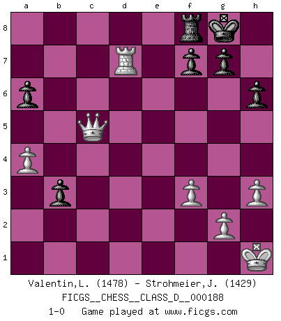 Last move : 1-0 2013 April 6 18:55:5 [Event "FICGS__CHESS__CLASS_D__000188"] [Site "FICGS"] [Date "2012.10.23"] [Round "1"] [White "Valentin,Laurentiu"] [Black "Strohmeier,Josef"] [Result "1-0"] [WhiteElo "1478"] [BlackElo "1429"] 1.d4 d5 2.c4 e6 3.Nc3 Nf6 4.Bg5 Be7 5.Nf3 O-O 6.e3 h6 7.Bxf6 Bxf6 8.cxd5 exd5 9.Bd3 Bg4 10.O-O c6 11.Bc2 Nd7 12.h3 Bh5 13.Qd3 Bg6 14.Qd2 Bxc2 15.Qxc2 Re8 16.Nd2 Rc8 17.Rac1 Be7 18.e4 dxe4 19.Ndxe4 Nf6 20.f3 c5 21.d5 c4 22.Rcd1 Qb6+ 23.Kh1 Red8 24.Ng3 a6 25.Nge4 Qc7 26.Nxf6+ Bxf6 27.Ne4 Be5 28.d6 Bxd6 29.Nxd6 Rxd6 30.Rxd6 Qxd6 31.a3 b5 32.Rd1 Qe5 33.a4 b4 34.Kg1 c3 35.bxc3 Qxc3 36.Qf5 b3 37.Rd7 Qc5+ 38.Kh1 Rf8 39.Qxc5 1-0 QGD : 4.Bg5 Be7 Kingside Castling by player Black (move 5) Kingside Castling by player White (move 10) Player White won this chess game. Follow this game move after move (download)A chess genius has died; a loss for humanity. (Viktor Kortchnoi, about Bobby Fischer's death) Privat ist Kortschnoi kein schlechter Mensch, sehr sympathisch. Aber während des Spiels ist er grausam. Er will dich töten. (Miguel Najdorf) Cada Peón es potencialmente una Reina. (James Mason) Les échecs, c'est la lutte contre l'erreur. (Johannes Zukertort) A shortcut is the longest distance between two points. (Don Groves)