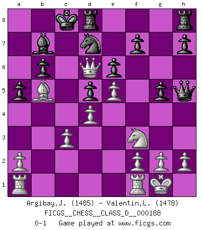 Last move : 0-1 2013 January 25 12:45:6 [Event "FICGS__CHESS__CLASS_D__000188"] [Site "FICGS"] [Date "2012.10.23"] [Round "1"] [White "Argibay,Jorge"] [Black "Valentin,Laurentiu"] [Result "0-1"] [WhiteElo "1485"] [BlackElo "1478"] 1.d4 d5 2.c4 e6 3.cxd5 Qxd5 4.Nc3 Bb4 5.Nf3 Nf6 6.Qc2 b6 7.Bf4 Ne4 8.e3 Bb7 9.Bd3 Nd7 10.O-O Nxc3 11.bxc3 Bd6 12.e4 Qh5 13.Bxd6 cxd6 14.Qa4 a6 15.Qb4 d5 16.e5 a5 17.Qd6 O-O-O 18.Bb5 g5 0-1 Queen's gambit declined Kingside Castling by player White (move 10) Queenside Castling by player Black (move 17) Player Black won this chess game. Follow this game move after move (download)If cunning alone were needed to excel, women would be the best Chess players. (Albin) Ich hatte Angst gegen einen russischen Großmeister zu verlieren, und er befürchtete gegen einen kleinen Jungen zu verlieren. (über ein Remis gegen Juri Awerbach). (Robert James Fischer) Hasta este punto, las blancas han seguido un análisis bien conocido. Pero ahora el hace un error fatal: empieza a usar su propia cabeza. (Siegbert Tarrasch) Il n'y a pas de prix trop élevé au scalp de l'ennemi. (Koblentz) He is a liar. I just don't know what the lie is yet. (Horatio Caine, C.S.I. Miami)