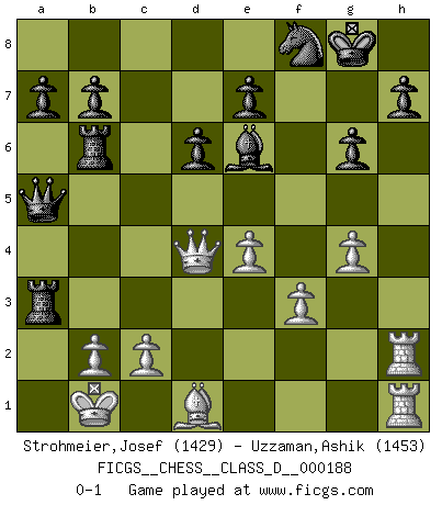 Last move : 0-1 2013 February 3 22:36:52 [Event "FICGS__CHESS__CLASS_D__000188"] [Site "FICGS"] [Date "2012.10.23"] [Round "1"] [White "Strohmeier,Josef"] [Black "Uzzaman,Ashik"] [Result "0-1"] [WhiteElo "1429"] [BlackElo "1453"] 1.e4 c5 2.Nf3 g6 3.d4 cxd4 4.Nxd4 Nc6 5.Nc3 Bg7 6.Be3 Nf6 7.f3 O-O 8.Qd2 d6 9.O-O-O Nxd4 10.Bxd4 Be6 11.Kb1 Nd7 12.Be2 Bxd4 13.Qxd4 Qa5 14.a3 Rfc8 15.Rd2 Rc7 16.h4 Rac8 17.g4 Rxc3 18.h5 R3c6 19.hxg6 fxg6 20.Bd1 Nf8 21.Qe3 Rb6 22.Rdh2 Rc3 23.Qd4 Rxa3 0-1 Comment by player 2 : Ashik Uzzaman : A sicillian dragon win for me where White was too slow to buld the attack! Sicilian : Hungarian variation Kingside Castling by player Black (move 7) Queenside Castling by player White (move 9) Player Black won this chess game. Follow this game move after move (download)I have always a slight feeling of pity for the man who has no knowledge of Chess. (Siegbert Tarrasch) Das ganze Leben mit einer Ehefrau ist wie ein Endspiel mit ungleichfarbigen Läufern. (Viktor Kortschnoi) La belleza de un movimiento no se refleja solo en su apariencia, sino en el pensamiento detrás de él. (Siegbert Tarrasch) Il (Jacob Murray) ne joue pas pour le bon coup, mais pour le meilleur. (Eloi Relange) He who is a good ruler must first have been ruled. (Aristotle)