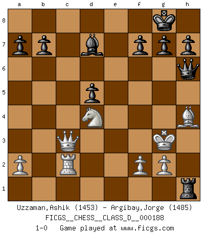Last move : 1-0 2013 January 25 12:45:6 [Event "FICGS__CHESS__CLASS_D__000188"] [Site "FICGS"] [Date "2012.10.23"] [Round "1"] [White "Uzzaman,Ashik"] [Black "Argibay,Jorge"] [Result "1-0"] [WhiteElo "1453"] [BlackElo "1485"] 1.e4 c6 2.d4 d5 3.exd5 cxd5 4.Bd3 Nc6 5.c3 Nf6 6.Ne2 e5 7.dxe5 Nxe5 8.O-O Bd6 9.Re1 O-O 10.h3 Qb6 11.Qc2 Re8 12.Bg5 Bc5 13.Bh4 Bxh3 14.Na3 Nxd3 15.Qxd3 Ne4 16.Nd4 Bd7 17.Rad1 Qxb2 18.Nab5 Bxd4 19.Nxd4 Nxc3 20.Rxe8+ Rxe8 21.Rd2 Qc1+ 22.Kh2 Re1 23.Rc2 Rh1+ 24.Kg3 Qh6 25.Qxc3 1-0 Caro-Kann : Exchange variation Kingside Castling by player White (move 8) Kingside Castling by player Black (move 9) Player White won this chess game. Follow this game move after move (download)I still hope to kill Fischer. (Boris Spassky) Über die Verhaftung Bobby Fischers: Warum es die Bush-Administration für nötig befindet einen 61 Jahre alten Mann zu hetzten, der für niemanden ausser sich selbste eine Gefahr darstellt ist ein Rätsel. (Nigel Short) Los Peones son nacidos libres, y aún así, se encuentran por doquier encadenados. (Rick Kennedy) Si rien de grave n'est détecté lors de l'analyse d'une position, on joue alors le coup. Seconde règle de Blumenfeld. Beta. Software undergoes beta testing shortly before it's released. Beta is latin for still doesn't work. (Anonymous)