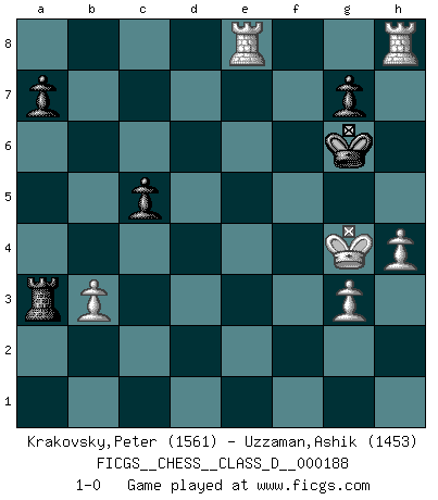 Last move : 1-0 2013 January 24 7:22:8 [Event "FICGS__CHESS__CLASS_D__000188"] [Site "FICGS"] [Date "2012.10.23"] [Round "1"] [White "Krakovsky,Peter"] [Black "Uzzaman,Ashik"] [Result "1-0"] [WhiteElo "1561"] [BlackElo "1453"] 1.c4 e5 2.g3 Nf6 3.Nc3 Nc6 4.Bg2 Bc5 5.Nf3 O-O 6.Nxe5 Bxf2+ 7.Kxf2 Nxe5 8.b3 d6 9.Rf1 c6 10.Kg1 Bg4 11.d4 Ng6 12.Bg5 Qa5 13.Qd2 Nd7 14.Ne4 Qxd2 15.Bxd2 Bxe2 16.Rfe1 Bg4 17.Nxd6 b6 18.h3 Be6 19.d5 cxd5 20.cxd5 Bxd5 21.Bxd5 Rad8 22.Bb4 Nc5 23.Bxc5 bxc5 24.Rad1 h5 25.Nxf7 Rxd5 26.Rxd5 Rxf7 27.Re8+ Nf8 28.Rxh5 Rd7 29.Rf5 Rd1+ 30.Kg2 Rd2+ 31.Kf3 Rxa2 32.R5xf8+ Kh7 33.Rh8+ Kg6 34.h4 Ra3 35.Kg4 1-0 English Opening Kingside Castling by player Black (move 5) Player White won this chess game. Follow this game move after move (download)I like the moment when I break a man's ego. (Bobby Fischer) Zu meiner Zeit war ein 20 jähriger ein junger Spieler, heute ist er ein Veteran. (Garry Kasparov) El Ajedrez es un juego de pelea el cual es puramente intelectual e incluye la suerte. (Richard Reti) La vérité est comme le meilleur coup aux échecs : elle existe, mais il faut la chercher. (Arturo Perez-Reverte) Either move or be moved. (Ezra Pound)