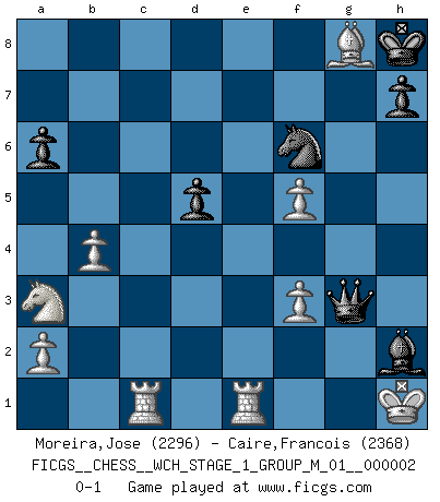 Last move : 0-1 2007 February 11 22:18:33 [Event "FICGS__CHESS__WCH_STAGE_1_GROUP_M_01__000002"] [Site "FICGS"] [Date "2007.01.16"] [Round "1"] [White "Moreira,Jose"] [Black "Caire,Francois"] [Result "0-1"] [WhiteElo "2296"] [BlackElo "2368"] 1.e4 c5 2.Nf3 Nc6 3.d4 cxd4 4.Nxd4 Nf6 5.Nc3 e5 6.Ndb5 d6 7.Bg5 a6 8.Na3 b5 9.Bxf6 gxf6 10.Nd5 f5 11.Bd3 Be6 12.O-O Bxd5 13.exd5 Ne7 14.c3 Bg7 15.Qh5 e4 16.Bc2 Qc8 17.Rae1 O-O 18.Kh1 Rb8 19.g4 b4 20.cxb4 Nxd5 21.gxf5 Kh8 22.Bxe4 Nf6 23.Qf3 Rxb4 24.b3 Qc5 25.Rc1 Qe5 26.Bc6 d5 27.Rfe1 Qd6 28.Qg3 Rf4 29.b4 Rg8 30.f3 Bh6 31.Qh3 Bg5 32.Qf1 Rh4 33.Qf2 Rh5 34.Be8 Bf4 35.Bxf7 Rxh2+ 36.Qxh2 Bxh2 37.Bxg8 Qg3 0-1 Sicilian : Pelikan (Lasker/Sveshnikov) variation Kingside Castling by player White (move 12) Kingside Castling by player Black (move 17) Player Black won this chess game. Follow this game move after move (download)In the perfect Chess combination as in a first-rate short story, the whole plot and counter-plot should lead up to a striking finale, the interest not being allayed until the very last moment. (Yates and Winter) Ich hatte meine größten Erfolge, als ich 47 Jahre alt war. Kasparow war noch nicht mal 42 und hat das Schach schon im Stich gelassen. (Viktor Kortschnoi) Con o sin el título, Bobby Fischer fue sin lugar a dudas el mas grande jugador de su época. (Burt Hochberg) Si je n'étais pas joueur d'échecs, je serais le meilleur dans quelque chose d'autre. (Anatoli Karpov) Men should grow up. - Yeah. And dogs should stop licking themselves. It's not gonna happen. (Gregory House to Dr. Cameron, House M.D.)