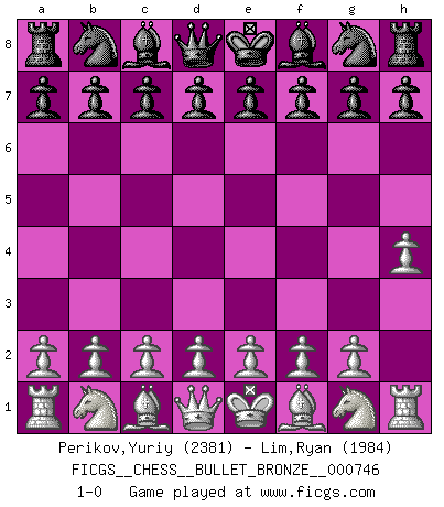 Last move : 1-0 2012 October 25 22:32:38 [Event "FICGS__CHESS__BULLET_BRONZE__000746"] [Site "FICGS"] [Date "2012.10.25"] [Round "1"] [White "Perikov,Yuriy"] [Black "Lim,Ryan"] [Result "1-0"] [WhiteElo "2381"] [BlackElo "1984"] 1.h4 1-0 This chess game has been lost on time (started : 2012.10.25 13:45:19) Anti-Borg (Desprez) Opening Player White won this chess game. Follow this game move after move (download)Pawns: they are the soul of this game, they alone form the attack and defense. (Philidor) Es liegt in der Natur, vernüftig zu denken und unlogisch zu handeln. (Anatole France) En la vida, como en el Ajedrez, los Peones propios obstruyen nuestro camino. La gran fortuna de un hombre, su comodidad, placer, hijos, libros, que deberían ayudarle a ganar, con mucha frecuencia lo ponen en Jaque Mate. (Charles Buxton) La tactique est l'élément le plus important du milieu de jeu. (Siegbert Tarrasch) The intuitive mind is a sacred gift; the rational mind is a faithful servant. We have created a society that honors the servant but has forgotten the gift. (Albert Einstein)