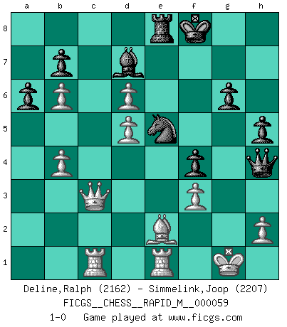 Last move : 1-0 2012 November 11 23:41:0 [Event "FICGS__CHESS__RAPID_M__000059"] [Site "FICGS"] [Date "2012.10.26"] [Round "1"] [White "Deline,Ralph"] [Black "Simmelink,Joop"] [Result "1-0"] [WhiteElo "2162"] [BlackElo "2207"] 1.e4 c5 2.Nf3 d6 3.Bb5+ Nd7 4.a4 Ngf6 5.Nc3 e6 6.d4 cxd4 7.Qxd4 a6 8.Be2 e5 9.Qe3 Nc5 10.O-O Be7 11.Rd1 Qc7 12.b4 Ne6 13.Qd3 O-O 14.Nd5 Nxd5 15.exd5 Nd8 16.Nd2 f5 17.Qc4 Qb8 18.Qb3 Nf7 19.a5 Bd7 20.Bb2 Kh8 21.Re1 Bg5 22.Nc4 Bd8 23.f4 exf4 24.Bd4 Kg8 25.Qb2 g6 26.Nb6 Bxb6 27.axb6 Qd8 28.c4 Qh4 29.c5 Rae8 30.Bg7 f3 31.gxf3 Ne5 32.Bxf8 Kxf8 33.Qc3 f4 34.Rac1 h5 35.cxd6 1-0 Sicilian : Canal-Sokolsky (Nimzovich-Rossolimo, Moscow) attack Kingside Castling by player White (move 10) Kingside Castling by player Black (move 13) Player White won this chess game. Follow this game move after move (download)If a ruler does not understand Chess, how can he rule over a kingdom ? (King Khusros II) Wie kann ich Remis annehmen? Ich weiß ja gar nicht, wie ich stehe! (Fritz Sämisch) No soy una persona materialista y por eso, no resiento la falta o pérdida del dinero. La ausencia de cosas mundanas carece de importancia. Ya que el Ajedrez es una forma en la que puedo ser tan materialista como yo desee sin tener la necesidad de vender mi alma. (Jamie Walter Adams) Le temps de noter son nom sur la feuille de partie, j'étais déjà en zeitnot ! D'un modeste amateur apparié lors de la première ronde d'un open contre le grand-maître Azmaïparashvili. A computer lets you make more mistakes faster than any invention in human history - with the possible exceptions of handguns and tequila. (Mitch Ratcliffe)