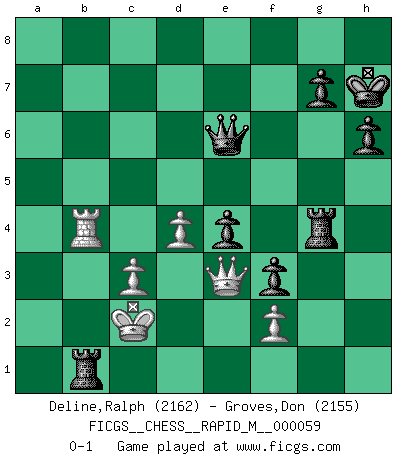 Last move : 0-1 2012 November 23 0:27:50 [Event "FICGS__CHESS__RAPID_M__000059"] [Site "FICGS"] [Date "2012.10.26"] [Round "1"] [White "Deline,Ralph"] [Black "Groves,Don"] [Result "0-1"] [WhiteElo "2162"] [BlackElo "2155"] 1.e4 c5 2.Nf3 d6 3.Bb5+ Bd7 4.Bxd7+ Qxd7 5.O-O Nc6 6.d3 Nf6 7.h3 e6 8.Bf4 Be7 9.Nbd2 O-O 10.a4 Bd8 11.Re1 Rc8 12.c3 h6 13.Nh2 Re8 14.Qf3 e5 15.Bg3 d5 16.Qd1 Bc7 17.Bh4 Re6 18.Bxf6 Rxf6 19.exd5 Qxd5 20.Ne4 Rg6 21.Nf1 Qd7 22.h4 Qh3 23.Ne3 Qxh4 24.Nf5 Qd8 25.Nxc5 Qg5 26.Ne3 f5 27.Qf3 Bb6 28.b4 Bxc5 29.bxc5 Rf8 30.Nd5 Kh7 31.Rad1 f4 32.Kf1 Rf5 33.Rb1 Rf7 34.Nb4 Nd8 35.Rb2 Rf5 36.a5 Ne6 37.a6 bxa6 38.c6 Nc7 39.Ra2 Qd8 40.Nxa6 Rfg5 41.Nxc7 Qxc7 42.Rb1 Rxg2 43.Ke2 R2g5 44.Qe4 f3+ 45.Kd2 Rg4 46.Qe3 Qxc6 47.Rxa7 Rd6 48.Rab7 e4 49.d4 Qd5 50.R7b5 Qa2+ 51.R1b2 Ra6 52.R5b4 Qe6 53.Kc2 Ra1 54.Rb1 Rxb1 0-1 Sicilian : Canal-Sokolsky attack, 3...Bd7 Kingside Castling by player White (move 5) Kingside Castling by player Black (move 9) Player Black won this chess game. Follow this game move after move (download)Fischer is completely natural. He plays no roles. He's like a child. Very, very simple. (Zita Rajcsanyi) Als ich elf wurde, wurde ich einfach gut. (Robert James Fischer) No todos los artistas son jugadores de Ajedrez, pero todos los jugadores de Ajedrez son artistas. (Marcel Duchamp) Les échecs, c'est la lutte contre l'erreur. (Johannes Zukertort) Chess, like love, like music, has the power to make people happy. (Siegbert Tarrasch)