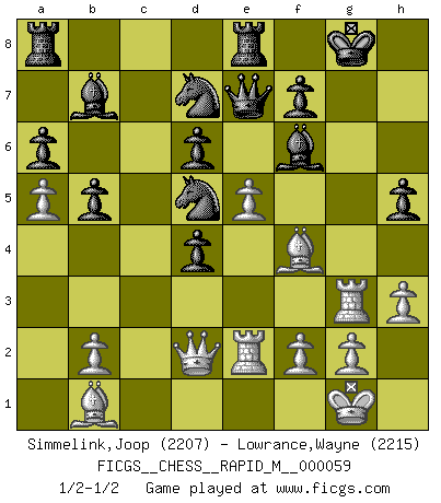 Last move : 1/2-1/2 2012 December 8 23:17:48 [Event "FICGS__CHESS__RAPID_M__000059"] [Site "FICGS"] [Date "2012.10.26"] [Round "1"] [White "Simmelink,Joop"] [Black "Lowrance,Wayne"] [Result "1/2-1/2"] [WhiteElo "2207"] [BlackElo "2215"] 1.e4 e5 2.Nf3 Nc6 3.Bb5 a6 4.Ba4 Nf6 5.O-O Be7 6.Re1 b5 7.Bb3 O-O 8.c3 d6 9.h3 Re8 10.d4 Bb7 11.Nbd2 Bf8 12.a4 exd4 13.cxd4 h6 14.Bc2 Nb4 15.Bb1 c5 16.d5 g6 17.Nf1 Bg7 18.Ra3 Nd7 19.a5 Qc7 20.Ng3 Qd8 21.Re2 Qf6 22.Be3 Qe7 23.Qd2 h5 24.Bf4 Bf6 25.Nxh5 gxh5 26.e5 Nxd5 27.Nd4 cxd4 28.Rg3+ 1/2-1/2 Ruy Lopez : Closed, 7...O-O Kingside Castling by player White (move 5) Kingside Castling by player Black (move 7) This chess game ended in a draw. Follow this game move after move (download)The boy (then a 12 year old boy named Anatoly Karpov) doesn't have a clue about Chess, and there's no future at all for him in this profession. (Mikhail Botvinnik) Jeder Fehler erscheint unglaublich dumm, wenn andre ihn begehen. (Georg Christoph Lichtenberg) Un mal día en el Ajedrez, es mejor que cualquier buen día en el trabajo. (Anonymous) Toutes choses étant égales, c'est la conviction qui gagne. Alliée à une volonté de vaincre, elle sert de détonateur, suscite des idées, disperse les doutes et aide à penser clairement. (Robert Fischer) I think your argument is specious - I think your tie is ugly. (Gregory House to Dr. Foreman, House M.D.)
