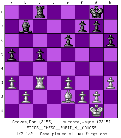 Last move : 1/2-1/2 2012 December 4 22:42:31 [Event "FICGS__CHESS__RAPID_M__000059"] [Site "FICGS"] [Date "2012.10.26"] [Round "1"] [White "Groves,Don"] [Black "Lowrance,Wayne"] [Result "1/2-1/2"] [WhiteElo "2155"] [BlackElo "2215"] 1.d4 Nf6 2.c4 e6 3.Nf3 d5 4.Nc3 c6 5.Bg5 h6 6.Bxf6 Qxf6 7.e3 Nd7 8.Bd3 Bd6 9.O-O Qe7 10.Qc2 dxc4 11.Bxc4 O-O 12.Rfd1 Rd8 13.h3 a5 14.a3 Rb8 15.Ne4 b6 16.Nxd6 Qxd6 17.Ne5 Bb7 18.Nxd7 Rxd7 19.Be2 c5 20.dxc5 Qxc5 21.Qxc5 Rxd1+ 22.Rxd1 bxc5 23.Rc1 Rc8 24.Rc3 1/2-1/2 Queen's pawn game Kingside Castling by player White (move 9) Kingside Castling by player Black (move 11) This chess game ended in a draw. Follow this game move after move (download)Could we look into the head of a Chess player, we should see there a whole world of feelings, images, ideas, emotion and passion. (Alfred Binet) Schach ist die gewalttätigste aller Sportarten. (Garry Kasparov) Si tu oponente te ofrece un empate, trata de averiguar porque piensa él que esta en una posición peor. (Nigel Short) Un millionnaire : 'Monsieur Steinitz ! Vous ne participez aux tournois que pour l'argent, alors que moi je n'y viens que pour l'honneur.' Steinitz : 'Chacun joue pour ce qu'il n'a pas'... There's always a bigger fish. (Qui-Gon Jinn in Star Wars ep.1)
