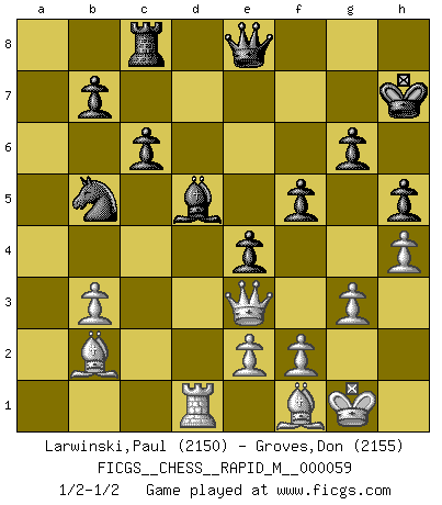 Last move : 1/2-1/2 2012 December 6 19:28:30 [Event "FICGS__CHESS__RAPID_M__000059"] [Site "FICGS"] [Date "2012.10.26"] [Round "1"] [White "Larwinski,Paul"] [Black "Groves,Don"] [Result "1/2-1/2"] [WhiteElo "2150"] [BlackElo "2155"] 1.Nf3 Nf6 2.b3 d5 3.Bb2 c6 4.g3 Bg4 5.Bg2 Nbd7 6.O-O e6 7.d3 Bd6 8.Nbd2 O-O 9.Qe1 e5 10.h3 Bh5 11.Nh4 a5 12.Nf5 Bc5 13.Nf3 Re8 14.Qd2 Bb4 15.c3 Bf8 16.c4 a4 17.Rab1 axb3 18.axb3 Qb6 19.d4 Ne4 20.Qc2 f6 21.Rfc1 Bf7 22.Nd2 g6 23.c5 Qb5 24.Nxe4 dxe4 25.Nd6 Bxd6 26.cxd6 exd4 27.Bxd4 Qb4 28.Be3 f5 29.Qd1 Bd5 30.Bf4 Ne5 31.Ra1 Rad8 32.Qc2 Qxd6 33.Ra7 Rd7 34.Rca1 Qf8 35.Qc3 Nf7 36.Bc1 h6 37.Bb2 Kh7 38.Ra8 Nd6 39.Rxe8 Qxe8 40.Rd1 Qg8 41.Qe5 Qe8 42.Qc3 Nb5 43.Qc5 Rf7 44.Qb6 Rc7 45.Qe3 Rc8 46.h4 h5 47.Bf1 1/2-1/2 Reti Opening Kingside Castling by player White (move 6) Kingside Castling by player Black (move 8) This chess game ended in a draw. Follow this game move after move (download)Combinations have always been the most intriguing aspect of Chess. The masters look for them, the public applauds them, the critics praise them. It is because combinations are possible that Chess is more than a lifeless mathematical exercise. They are the poetry of the game; they are to Chess what melody is to music. They represent the triumph of mind over matter. (Reuben Fine) Sie führen leise Selbstgespräche, schlürfen lautstark ihre Getränke, schmatzen hörbar beim Essen, blasen ihrem Gegenüber Rauch in die Augen, niesen ihm ins Gesicht, starren ihn unverwandt an, bis er sich unter ihren Blicken windet, rutschen ständig auf ihrem Stuhl hin und her, rülpsen und bohren in der Nase. (Anonymous) La partida mas dura de ganar es una partida ganada. (Emanuel Lasker) Les Echecs mettent en conflit, non pas deux intelligences, mais deux volontés. (Lasker) Internal peace cannot coexist with external war. (Don Groves)