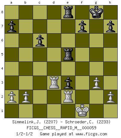 Last move : 1/2-1/2 2012 November 24 0:48:27 [Event "FICGS__CHESS__RAPID_M__000059"] [Site "FICGS"] [Date "2012.10.26"] [Round "1"] [White "Simmelink,Joop"] [Black "Schroeder,Christoph"] [Result "1/2-1/2"] [WhiteElo "2207"] [BlackElo "2233"] 1.e4 e5 2.Nf3 Nc6 3.Bb5 Nf6 4.Nc3 Nd4 5.Ba4 c6 6.Nxe5 d5 7.d3 Bd6 8.f4 Bc5 9.exd5 O-O 10.dxc6 bxc6 11.Ne4 Nxe4 12.dxe4 Qh4+ 13.g3 Qh3 14.Be3 Qg2 15.Rg1 Qxe4 16.Qd3 Nxc2+ 17.Bxc2 Qxe3+ 18.Qxe3 Bxe3 19.Rg2 g5 20.Rd1 Bh3 21.Re2 gxf4 22.Rd3 Be6 23.Bb3 Rfe8 24.Bxe6 Rxe6 25.Ng4 Rae8 26.Nxe3 fxe3 27.Kf1 Re5 1/2-1/2 Ruy Lopez : Berlin defense Kingside Castling by player Black (move 9) This chess game ended in a draw. Follow this game move after move (download)To avoid losing a piece, many a person has lost the game. (Savielly Tartakover) Viele Opfer benötigen überhaupt keine konkrete Berechnung. Es genügt sich die entstehende Position kurz vorzustellen, um uns davon zu überzeugen, dass das Opfer korrekt ist. (Mikhail Nekhemyevich Tal) Mi estilo es algo parecido entre un poco de Tal y Petrosian. (Reshevsky) Il n'y a pas eu de défaite parce que je ne crois pas que cet ordinateur ait jamais existé. IBM a triché en refusant d'imprimer les modes de recherche de la machine. C'est évident, pendant le match, des coups décisifs ont été joués par des êtres humains. Aujourd'hui, les meilleurs spécialistes en informatique ne peuvent toujours pas expliquer comment Deep-Blue a pu jouer contre la logique des ordinateurs. IBM a gagné une guerre de communication, mais ils sont incapables de prouver que l'ordinateur a gagné tout seul. (Garry Kasparov) The smarter you play, the luckier you'll be. (Mark Pilarski)