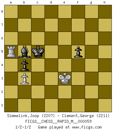 Last move : 1/2-1/2 2013 January 8 23:54:5 [Event "FICGS__CHESS__RAPID_M__000059"] [Site "FICGS"] [Date "2012.10.26"] [Round "1"] [White "Simmelink,Joop"] [Black "Clement,George"] [Result "1/2-1/2"] [WhiteElo "2207"] [BlackElo "2211"] 1.e4 c5 2.Nf3 Nc6 3.d4 cxd4 4.Nxd4 e5 5.Nb5 d6 6.N1c3 a6 7.Na3 b5 8.Nd5 Nf6 9.c4 b4 10.Nxf6+ Qxf6 11.Nc2 Be7 12.Ne3 O-O 13.Bd3 Qg6 14.O-O Bg5 15.Nd5 a5 16.f4 exf4 17.h4 Bxh4 18.e5 Bg4 19.Bxg6 Bxd1 20.Bd3 Bg4 21.exd6 Ne5 22.Be4 Rae8 23.Rxf4 f5 24.Bc2 Nd7 25.Be3 Bg5 26.Bf2 Bxf4 27.Nxf4 g5 28.Ba4 Nf6 29.Bxe8 Rxe8 30.c5 gxf4 31.Bh4 Kf7 32.Bxf6 Kxf6 33.d7 Rg8 34.Re1 Bf3 35.Re8 Rxg2+ 36.Kf1 Rd2 37.d8Q+ Rxd8 38.Rxd8 Ke7 39.Rd6 h5 40.Kf2 Be4 41.Ke2 h4 42.Rh6 Kd7 43.Rxh4 Kc6 44.Rxf4 Bb1 45.Rf1 Bxa2 46.Ra1 Bc4+ 47.Kf2 Kxc5 48.Rxa5+ Bb5 49.Ke3 Kc4 50.b3+ Kc5 1/2-1/2 Sicilian : Labourdonnais-Loewenthal (Kalashnikov) variation Kingside Castling by player Black (move 12) Kingside Castling by player White (move 14) Promotion Queen by player White (move 37) 10 pieces endgame at move 44 : White KRPPP , Black KBPPP WHITE : King + 1 Rook 3 Pawns BLACK : King + 1 Bishop 3 Pawns 9 pieces endgame at move 45 : White KRPP , Black KBPPP WHITE : King + 1 Rook 2 Pawns BLACK : King + 1 Bishop 3 Pawns 8 pieces endgame at move 47 : White KRP , Black KBPPP WHITE : King + 1 Rook 1 Pawn BLACK : King + 1 Bishop 3 Pawns 7 pieces endgame at move 48 : White KRP , Black KBPP WHITE : King + 1 Rook 1 Pawn BLACK : King + 1 Bishop 2 Pawns This chess game ended in a draw. Follow this game move after move (download)A big shock; the best chess player in history has passed away. (Lajos Portisch, about Bobby Fischer's death) Er war ein guter Schachspieler, aber ich kann Leute nicht ausstehen, die 'Heil Hitler' rufen (Über Alexander Aljechin). (Miguel Najdorf) No hay un Gran Maestro de Ajedrez que sea normal; solo se diferencían ellos por la magnitud de su locura. (Viktor Korchnoi) L'attaque fait le spectacle, la défense gagne les matchs. (Dicton footballistique) The various flowers seem good to different people. (Chinese proverb)