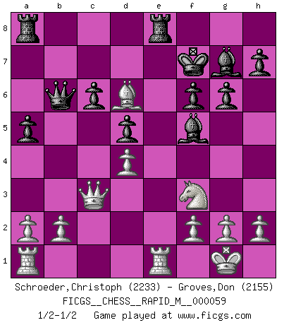 Last move : 1/2-1/2 2012 November 7 7:36:0 [Event "FICGS__CHESS__RAPID_M__000059"] [Site "FICGS"] [Date "2012.10.26"] [Round "1"] [White "Schroeder,Christoph"] [Black "Groves,Don"] [Result "1/2-1/2"] [WhiteElo "2233"] [BlackElo "2155"] 1.d4 Nf6 2.Nf3 d5 3.e3 c5 4.c4 cxd4 5.exd4 g6 6.cxd5 Nxd5 7.Qb3 e6 8.Nc3 Nc6 9.Bg5 Qb6 10.Bb5 Bg7 11.Qa3 f6 12.Nxd5 exd5 13.Bxc6+ bxc6 14.O-O Kf7 15.Bf4 Bf5 16.Bd6 Rhe8 17.Rfe1 a5 18.Qc3 1/2-1/2 Queen's pawn game Kingside Castling by player White (move 14) This chess game ended in a draw. Follow this game move after move (download)I'm not afraid of Spassky. The world knows I'm the best. You don't need a match to prove it. (Bobby Fischer) Ohne Fehler kann es keine Brillanz geben. (Emanuel Lasker) Bobby es el jugador de Ajedrez mas fino que este país jamás haya producido. Su memoria para las movidas, su brillantez en soñar combinaciones y su feróz determinación por la victoria son algo extraño. (John Collins) Les réformistes prétendent que les progrès de la théorie conduiront à la disparition des échecs, et qu'il faut, pour leur rendre vie, en remanier les règles. En réalité, qu'exprime cette affirmation? Le mépris de l'intuition, de l'imagination et de tous les autres éléments qui font des échecs un art. (Alexander Alekhine) No, no, you're not thinking; you're just being logical. (Niels Bohr)