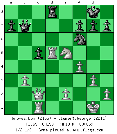 Last move : 1/2-1/2 2012 December 6 21:23:35 [Event "FICGS__CHESS__RAPID_M__000059"] [Site "FICGS"] [Date "2012.10.26"] [Round "1"] [White "Groves,Don"] [Black "Clement,George"] [Result "1/2-1/2"] [WhiteElo "2155"] [BlackElo "2211"] 1.d4 Nf6 2.c4 e6 3.Nf3 b6 4.g3 Ba6 5.b3 d5 6.Bg2 Bb4+ 7.Bd2 Bxd2+ 8.Nbxd2 O-O 9.Ne5 c5 10.O-O Bb7 11.dxc5 bxc5 12.Rc1 Qd6 13.f4 Nc6 14.cxd5 exd5 15.Ndc4 Qc7 16.Nxc6 dxc4 17.Ne5 Bxg2 18.Kxg2 Rad8 19.Qc2 cxb3 20.axb3 Qb7+ 21.Kg1 Rd5 22.Rfd1 Rfd8 23.Rxd5 1/2-1/2 Queen's Indian : Nimzovich variation (exaggerated Fianchetto) Kingside Castling by player Black (move 8) Kingside Castling by player White (move 10) This chess game ended in a draw. Follow this game move after move (download)Only the player with the initiative has the right to attack. (Wilhelm Steinitz) Das Schachspiel übertrifft alle anderen Spiele so weit wie der Chimborasso einen Misthaufen. (Arthur Schopenhauer) No es suficiente ser un buen jugador, se debe también de jugar bién. (Siegbert Tarrasch) Ne tendez aucun piège pour le plaisir ! Ne jouez rien dans l'espoir que l'adversaire réagisse de façon stupide ! Prenez toujours pour acquis que l'adversaire va trouver le meilleur coup ! Ne jouez jamais de coup dans l'espoir que l'adversaire ne voie pas la menace ! Chacun de vos coups doit améliorer la position d'une façon ou d'une autre. There are three kinds of lies: lies, damned lies and statistics. (Mark Twain)