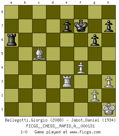 Last move : 1-0 2012 December 30 17:57:14 [Event "FICGS__CHESS__RAPID_A__000131"] [Site "FICGS"] [Date "2012.10.27"] [Round "1"] [White "Bellegotti,Giorgio"] [Black "Jabot,Daniel"] [Result "1-0"] [WhiteElo "2088"] [BlackElo "1934"] 1.d4 Nf6 2.c4 g6 3.Nc3 Bg7 4.e4 d6 5.Nf3 O-O 6.Be2 c5 7.O-O cxd4 8.Nxd4 a6 9.Be3 Nc6 10.Rc1 Ne5 11.f3 Bd7 12.Qd2 Rc8 13.Nd5 Nc6 14.Nc2 Be6 15.b4 Re8 16.a4 Nd7 17.a5 f5 18.exf5 Bxf5 19.Nb6 Nxb6 20.Bxb6 Qd7 21.b5 Ne5 22.Nd4 Nf7 23.Nxf5 Qxf5 24.f4 Rf8 25.Kh1 Kh8 26.bxa6 bxa6 27.c5 dxc5 28.Bxa6 Rc6 29.Bb5 Rd6 30.Qe3 Qe6 31.Qxe6 Rxe6 32.Bxc5 Nd6 33.Bd3 Ne4 34.Bg1 Nc3 35.a6 Rd6 36.Rf3 Ra8 37.Bc4 Rdxa6 38.Bxa6 Rxa6 39.Rfxc3 Bxc3 40.Rxc3 Kg7 41.h3 Kf6 42.Bd4+ Ke6 43.Re3+ Kf7 44.Bc5 1-0 King's Indian : 6.Be2 Kingside Castling by player Black (move 5) Kingside Castling by player White (move 7) Player White won this chess game. Follow this game move after move (download)Chess is really ninety nine percent calculation. (Soltis) Dass jemand wie Surab Asmaiparaschwili, der selbst Elopunkte gekauft hat , Vize-Präsident der Fide werden konnte, sagt schon einges über den Zustand dieser Organisation aus. (Joel Lautier) El poder defensivo de una pieza clavada, solamente es imaginario. (Aaron Nimzovich) La solitude du joueur d'Echecs à l'approche du mat est semblable à celle du condamné. (Francis Szpiner) O divine art of subtlety and secrecy! Through you we learn to be invisible, through you inaudible and hence we can hold the enemy's fate in our hands. (Sun Tzu)