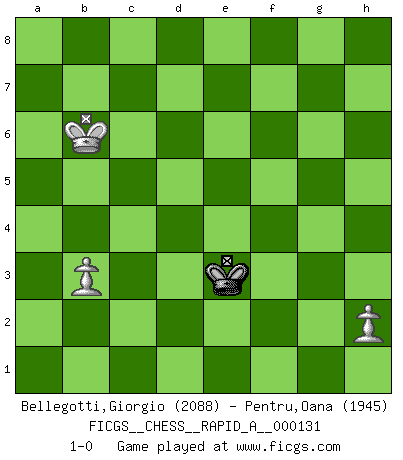 Last move : 1-0 2012 December 14 19:5:12 [Event "FICGS__CHESS__RAPID_A__000131"] [Site "FICGS"] [Date "2012.10.27"] [Round "1"] [White "Bellegotti,Giorgio"] [Black "Pentru,Oana"] [Result "1-0"] [WhiteElo "2088"] [BlackElo "1945"] 1.e4 e5 2.Nf3 Nc6 3.d4 exd4 4.Nxd4 Bc5 5.Be3 Qf6 6.c3 Nge7 7.Bc4 Ne5 8.Be2 Qg6 9.O-O d6 10.f3 O-O 11.Nd2 d5 12.Kh1 dxe4 13.fxe4 a5 14.Bf4 Bd6 15.Nb5 N7c6 16.Bh5 Qe6 17.Nf3 Qe7 18.Nxd6 cxd6 19.Nd4 a4 20.Qd2 Nc4 21.Qc2 Bd7 22.Nf5 Bxf5 23.exf5 Qf6 24.Be2 d5 25.Rad1 Rfd8 26.b3 axb3 27.axb3 N4a5 28.g4 h6 29.Bf3 Ne7 30.Qg2 Qxc3 31.g5 Nxf5 32.gxh6 Nc6 33.Bg5 Nce7 34.Bxe7 Nxe7 35.Rd3 Qf6 36.Bh5 Ra1 37.Rdf3 Rxf1+ 38.Qxf1 Qg5 39.Bxf7+ Kh7 40.Rg3 Qf5 41.Qxf5+ Nxf5 42.Bg6+ Kxh6 43.Bxf5 Rd6 44.Kg2 g6 45.Rxg6+ Rxg6+ 46.Bxg6 Kxg6 47.Kf3 Kf5 48.Ke3 b6 49.Kd4 Kf4 50.Kxd5 Kf3 51.Kc6 Ke3 52.Kxb6 1-0 Scotch game Kingside Castling by player White (move 9) Kingside Castling by player Black (move 10) 10 pieces endgame at move 43 : White KRBPP , Black KRPPP WHITE : King + 1 Rook 1 Bishop 2 Pawns BLACK : King + 1 Rook 3 Pawns 9 pieces endgame at move 45 : White KRBPP , Black KRPP WHITE : King + 1 Rook 1 Bishop 2 Pawns BLACK : King + 1 Rook 2 Pawns 8 pieces endgame at move 45 : White KBPP , Black KRPP WHITE : King + 1 Bishop 2 Pawns BLACK : King + 1 Rook 2 Pawns 7 pieces endgame at move 46 : White KBPP , Black KPP WHITE : King + 1 Bishop 2 Pawns BLACK : King + 2 Pawns 6 pieces endgame at move 46 : White KPP , Black KPP WHITE : King + 2 Pawns BLACK : King + 2 Pawns 5 pieces endgame at move 50 : White KPP , Black KP WHITE : King + 2 Pawns BLACK : King + 1 Pawn 4 pieces endgame at move 52 : White KPP , Black K WHITE : King + 2 Pawns BLACK : King + Player White won this chess game. Follow this game move after move (download)When I have White, I win because I am white; When I have Black, I win because I am Bogolyubov. (Bogolyubov) Ein Schachspiel besteht aus drei Phasen: Die erste, wenn du hofftst den Vorteil zu haben, die zweite, wenn du glaubst einen Vorteil zu haben, und die dritte.... wenn du weißt Du wirst verlieren. (Savielly Grigorievitsch Tartakower) Sin errores no puede haber brillantez. (Emanuel Lasker) C'est la seule position que je connaisse où les deux camps sont mals. Propos prêtés à V. Anand. Think like a man of action, act like a man of thought. (Henri Louis Bergson)