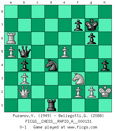 Last move : 0-1 2013 February 1 18:1:18 [Event "FICGS__CHESS__RAPID_A__000131"] [Site "FICGS"] [Date "2012.10.27"] [Round "1"] [White "Puzanov,Vasyl"] [Black "Bellegotti,Giorgio"] [Result "0-1"] [WhiteElo "1949"] [BlackElo "2088"] 1.d4 d5 2.c4 c6 3.cxd5 cxd5 4.Nf3 Nf6 5.Nc3 Nc6 6.Bf4 a6 7.e3 Bg4 8.Be2 e6 9.h3 Bxf3 10.Bxf3 Bd6 11.Bxd6 Qxd6 12.O-O O-O 13.Rc1 Rfc8 14.Qd2 b5 15.Rfd1 Qd8 16.Ne2 Na5 17.b3 Nb7 18.Ng3 Nd6 19.Rc5 g6 20.Rdc1 h5 21.h4 Kg7 22.Qb4 Rcb8 23.Qe1 Ra7 24.Rc6 Nfe8 25.e4 dxe4 26.Bxe4 Qxh4 27.Qe3 Rd8 28.Bf3 Qe7 29.Qe5+ Kg8 30.a4 h4 31.Ne2 Nf5 32.a5 Nf6 33.Rd1 Nd5 34.Bxd5 Rxd5 35.Rc8+ Rd8 36.Rdc1 Rad7 37.R1c6 Rd5 38.Qb8 Kg7 39.Rxa6 Rxc8 40.Qxc8 Rd8 41.Qc3 e5 42.dxe5 Rd1+ 43.Kh2 b4 44.Qb2 Qc5 45.Ng1 Nd4 46.Nf3 Qb5 0-1 QGD Slav defense : Exchange variation Kingside Castling by player White (move 12) Kingside Castling by player Black (move 12) Player Black won this chess game. Follow this game move after move (download)A man without frontiers. He didn't divide the East and the West, he brought them together in their admiration for him. (Ljubomir Ljubojevic, about Bobby Fischer's death) Warum muß ich gegen diesen IDIOTEN verlieren? (Aaron Nimzowitsch) Si tu oponente te ofrece un empate, trata de averiguar porque piensa él que esta en una posición peor. (Nigel Short) Les échecs, c'est l'art d'analyser. (Mikhail Botvinnik) Every man's memory is his private literature. (Aldous Huxley)