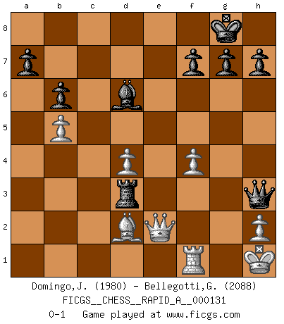 Last move : 0-1 2013 January 4 18:4:41 [Event "FICGS__CHESS__RAPID_A__000131"] [Site "FICGS"] [Date "2012.10.27"] [Round "1"] [White "Domingo,Jordi"] [Black "Bellegotti,Giorgio"] [Result "0-1"] [WhiteElo "1980"] [BlackElo "2088"] 1.b4 e5 2.a3 d5 3.Bb2 Bd6 4.Nf3 Qe7 5.e3 Nf6 6.c4 c6 7.cxd5 cxd5 8.Nc3 Nc6 9.b5 Na5 10.Qa4 b6 11.d4 e4 12.Nd2 Be6 13.Be2 Rc8 14.Rc1 O-O 15.O-O Ng4 16.Bxg4 Bxg4 17.Nxd5 Qe6 18.Rxc8 Rxc8 19.Nc3 Bf3 20.Nxf3 exf3 21.Qd1 Nc4 22.Bc1 Nxa3 23.Bb2 Nc4 24.Bc1 fxg2 25.Kxg2 Qg6+ 26.Kh1 Qh6 27.f4 Nxe3 28.Bxe3 Rxc3 29.Bd2 Rd3 30.Qe2 Qh3 0-1 Polish (Sokolsky) opening Kingside Castling by player Black (move 14) Kingside Castling by player White (move 15) Player Black won this chess game. Follow this game move after move (download)During a Chess competition a Chessmaster should be a combination of a beast of prey and a monk. (Alexander Alekhine) Ich hatte meine größten Erfolge, als ich 47 Jahre alt war. Kasparow war noch nicht mal 42 und hat das Schach schon im Stich gelassen. (Viktor Kortschnoi) No existe un remordimiento como el remordimiento del Ajedrez. (H. G. Wells) Les Echecs, c'est l'art de la guerre sans les charniers, c'est la résurrection des morts tombés au champ d'honneur, l'espoir perpétuel, la suprématie de l'intelligence sur la force, la culture de l'esprit. (F. Szpiner) When the going gets tactical, the computers get going. (Hyatt)