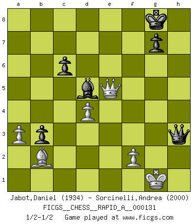 Last move : 1/2-1/2 2012 November 25 9:19:1 [Event "FICGS__CHESS__RAPID_A__000131"] [Site "FICGS"] [Date "2012.10.27"] [Round "1"] [White "Jabot,Daniel"] [Black "Sorcinelli,Andrea"] [Result "1/2-1/2"] [WhiteElo "1934"] [BlackElo "2000"] 1.e4 c6 2.d4 d5 3.exd5 cxd5 4.c4 Nf6 5.Nf3 Nc6 6.Nc3 Bg4 7.cxd5 Nxd5 8.Bb5 Rc8 9.O-O e6 10.h3 Bh5 11.g4 Bg6 12.Qa4 Bd6 13.Nxd5 Be4 14.Bg5 f6 15.Nf4 Bxf4 16.Bxf4 Bxf3 17.Qb3 Bd5 18.Bxc6+ bxc6 19.Qd3 O-O 20.Rfc1 a5 21.b3 Rf7 22.Rc3 Rb7 23.Rb1 Ra8 24.a3 Qe7 25.Ra1 h6 26.Qg6 Rf8 27.Bxh6 Rfb8 28.Bc1 Rxb3 29.Rxb3 Rxb3 30.Rb1 a4 31.Rxb3 axb3 32.Bb2 Qd7 33.g5 fxg5 34.Qxg5 e5 35.Qxe5 Qxh3 1/2-1/2 Caro-Kann : Panov-Botvinnik attack Kingside Castling by player White (move 9) Kingside Castling by player Black (move 19) This chess game ended in a draw. Follow this game move after move (download)The way he plays Chess demonstrates a man's whole nature. (Stanley Ellin) Ich verachte die Medien. (Robert James Fischer) Estaba muy claro de que el punto vulnerable del Gran Maestro Americano (Bobby Fischer) radicaba en las posiciones de doble filo, colgantes, irracionales, donde el siempre falló en encontrar un triunfo aún en una posición de clara victoria. (Efim Geller) Vous savez, camarade Pachman, je n'éprouve pas de plaisir à être ministre, je jouerais plutôt aux échecs comme vous, ou alors ferais une révolution au Venezuela. (Che Guevara à Ludek Pachman, 'Checkmate in Prague', 1975) Ah, the Socrating method. The best way we have of teaching everything-apart from juggling chainsaws. (Gregory House, House M.D.)
