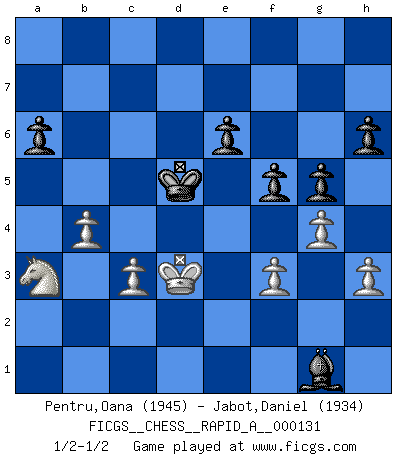 Last move : 1/2-1/2 2013 January 7 16:51:53 [Event "FICGS__CHESS__RAPID_A__000131"] [Site "FICGS"] [Date "2012.10.27"] [Round "1"] [White "Pentru,Oana"] [Black "Jabot,Daniel"] [Result "1/2-1/2"] [WhiteElo "1945"] [BlackElo "1934"] 1.e4 c5 2.Nf3 d6 3.Bb5+ Bd7 4.Bxd7+ Qxd7 5.O-O Nc6 6.c3 d5 7.exd5 Qxd5 8.d4 e6 9.Be3 cxd4 10.Nxd4 Nf6 11.Nd2 Be7 12.Qb3 O-O 13.Qxd5 Nxd5 14.Nxc6 bxc6 15.Nc4 Rfd8 16.Rad1 Rab8 17.Rfe1 c5 18.Rd2 g5 19.Red1 f5 20.f3 Nxe3 21.Nxe3 Kf7 22.Kf2 Rxd2+ 23.Rxd2 Rd8 24.Rxd8 Bxd8 25.Ke2 Bc7 26.h3 Ke7 27.Kd3 Bf4 28.Nc4 Kd7 29.g4 Kc6 30.b3 a6 31.a3 h6 32.b4 Kb5 33.Nb2 cxb4 34.axb4 Bc7 35.Kd4 Bh2 36.Nc4 Bg1+ 37.Kd3 Kc6 38.Na3 Kd5 1/2-1/2 Sicilian : Canal-Sokolsky attack, 3...Bd7 Kingside Castling by player White (move 5) Kingside Castling by player Black (move 12) This chess game ended in a draw. Follow this game move after move (download)Winning isn't everything... but losing is nothing. (Mednis) Im Fernschach kannst du während dem Spiel rauchen. (John Christen Knudsen) Debemos de asegurarnos de que el Ajedrez no se convierta en un lenguaje muerto, muy interesante, pero tan solo para un grupo muy pequeño. (Sytze Faber) Il n'y a plus de joueurs du niveau de Jacob Murray dont la seule quête est le beau jeu, le plaisir de voir les pièces construire quelque chose. Sur 10 idées à la minute, 9 seront sans intérêt, la dernière s'avèrera géniale. (Christian Bauer) No man has ever achieved immortality in his own life time. (Unknown)
