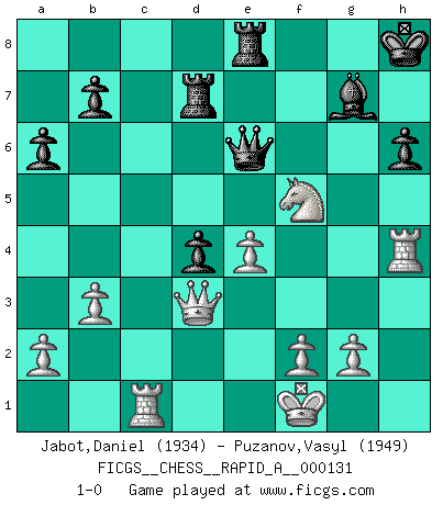 Last move : 1-0 2013 March 2 21:19:41 [Event "FICGS__CHESS__RAPID_A__000131"] [Site "FICGS"] [Date "2012.10.27"] [Round "1"] [White "Jabot,Daniel"] [Black "Puzanov,Vasyl"] [Result "1-0"] [WhiteElo "1934"] [BlackElo "1949"] 1.e4 c5 2.Nf3 d6 3.d4 cxd4 4.Nxd4 Nf6 5.Nc3 a6 6.Bg5 e5 7.Bxf6 Qxf6 8.Nd5 Qd8 9.Nf5 Nc6 10.c3 g6 11.Nfe3 Bg7 12.h4 Be6 13.h5 O-O 14.Qf3 h6 15.Be2 Ne7 16.Nxe7+ Qxe7 17.Bc4 Bxc4 18.Nxc4 Qe6 19.Nb6 Rad8 20.Nd5 Kh8 21.Rh3 f5 22.hxg6 Qxg6 23.Ne7 Qg5 24.Nxf5 d5 25.Qg3 Qf6 26.Qe3 d4 27.cxd4 exd4 28.Qd3 Rfe8 29.Kf1 Rd7 30.Rc1 Qb6 31.b3 Qe6 32.Rh4 1-0 Sicilian : Najdorf, 6.Bg5 Kingside Castling by player Black (move 13) Player White won this chess game. Follow this game move after move (download)I still hope to kill Fischer. (Boris Spassky) Es liegt in der Natur, vernüftig zu denken und unlogisch zu handeln. (Anatole France) Un buen sacrificio es aquel que aunque no sea necesariamente sólido, deja a tu oponente aturdido y confuso. (Rudolph Spielmann) La victoire dans une partie d'Echecs appartient la plupart du temps à celui qui voit un peu plus loin que l'adversaire. (Lasker) Now be brave and don't look back. Don't look back. (Shmi Skywalker in Star Wars ep.1)