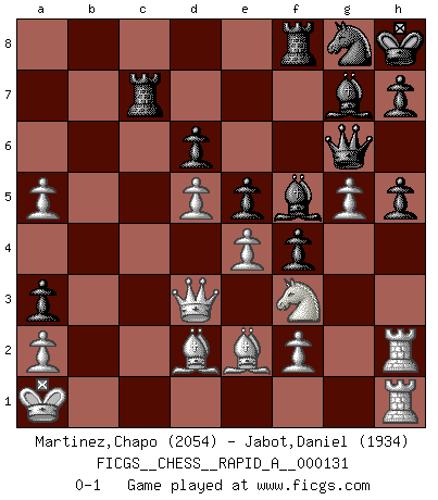 Last move : 0-1 2012 December 15 4:53:29 [Event "FICGS__CHESS__RAPID_A__000131"] [Site "FICGS"] [Date "2012.10.27"] [Round "1"] [White "Martinez,Chapo"] [Black "Jabot,Daniel"] [Result "0-1"] [WhiteElo "2054"] [BlackElo "1934"] 1.d4 Nf6 2.c4 g6 3.Nc3 Bg7 4.e4 d6 5.Nf3 O-O 6.h3 e5 7.d5 Na6 8.Bg5 Qe8 9.g4 Kh8 10.Be2 Ng8 11.Qc2 Bd7 12.O-O-O Nc5 13.Be3 a6 14.g5 b5 15.b4 Na4 16.Nxa4 bxa4 17.h4 a3 18.Qb1 f5 19.h5 gxh5 20.Rh2 f4 21.Bd2 Rc8 22.Rdh1 Bg4 23.Qb3 c6 24.Kb1 cxd5 25.cxd5 Qg6 26.Qd3 a5 27.bxa5 Rc7 28.Ka1 Bf5 0-1 King's Indian : 5.Nf3 Kingside Castling by player Black (move 5) Queenside Castling by player White (move 12) Player Black won this chess game. Follow this game move after move (download)I like the moment when I break a man's ego. (Bobby Fischer) Unter Putin wird alles Geld aus Russland wie von einem Staubsauger nach Moskau umgeleitet, das ist wie ein schwarzes Loch. (Garry Kasparov) De eso se trata el Ajedrez. Un día le das una lección a tu oponente y al día siguiente el te da una a tí. (Bobby Fischer) Le jeu d'échecs fait naître et fortifie en nous plusieurs qualités précieuses dans le cours de l'existence, telles que la prévoyance, la circonspection, la prudence, et la persévérance. (Benjamin Franklin - 1783, la morale des échecs) You have to believe in yourself. (Sun Tzu)
