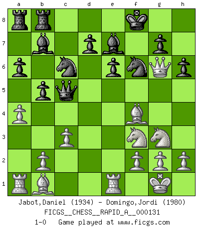Last move : 1-0 2013 January 1 14:48:56 [Event "FICGS__CHESS__RAPID_A__000131"] [Site "FICGS"] [Date "2012.10.27"] [Round "1"] [White "Jabot,Daniel"] [Black "Domingo,Jordi"] [Result "1-0"] [WhiteElo "1934"] [BlackElo "1980"] 1.e4 e6 2.d4 a6 3.Nf3 b5 4.Bd3 c5 5.c3 Bb7 6.O-O Nf6 7.Re1 h6 8.a4 cxd4 9.Nxd4 Nc6 10.e5 Nd5 11.Nf3 Qb6 12.Nbd2 Be7 13.Ne4 O-O 14.Bb1 Rfb8 15.Qc2 Kf8 16.Ng3 f5 17.exf6 Nxf6 18.Qg6 Qc5 19.Bf4 1-0 St. George defense Kingside Castling by player White (move 6) Kingside Castling by player Black (move 13) Player White won this chess game. Follow this game move after move (download)All I want to do, ever, is just play Chess. (Bobby Fischer) Um sich vor der Gefahr einer Erkältung zu schützen, sorge der wanderlustige König beizeiten für ein brauchbares Versteck. (Aaron Nimzowitsch) ¿Cual es el objetivo de jugar una apertura de gambito?... Para adquirir una reputación de ser un jugador apuesto a costo de perder el juego. (Siegbert Tarrasch) Aucun coup ne doit être joué sans but. (Pedro Damiano) When it is a question of money, everybody is of the same religion. (Voltaire)